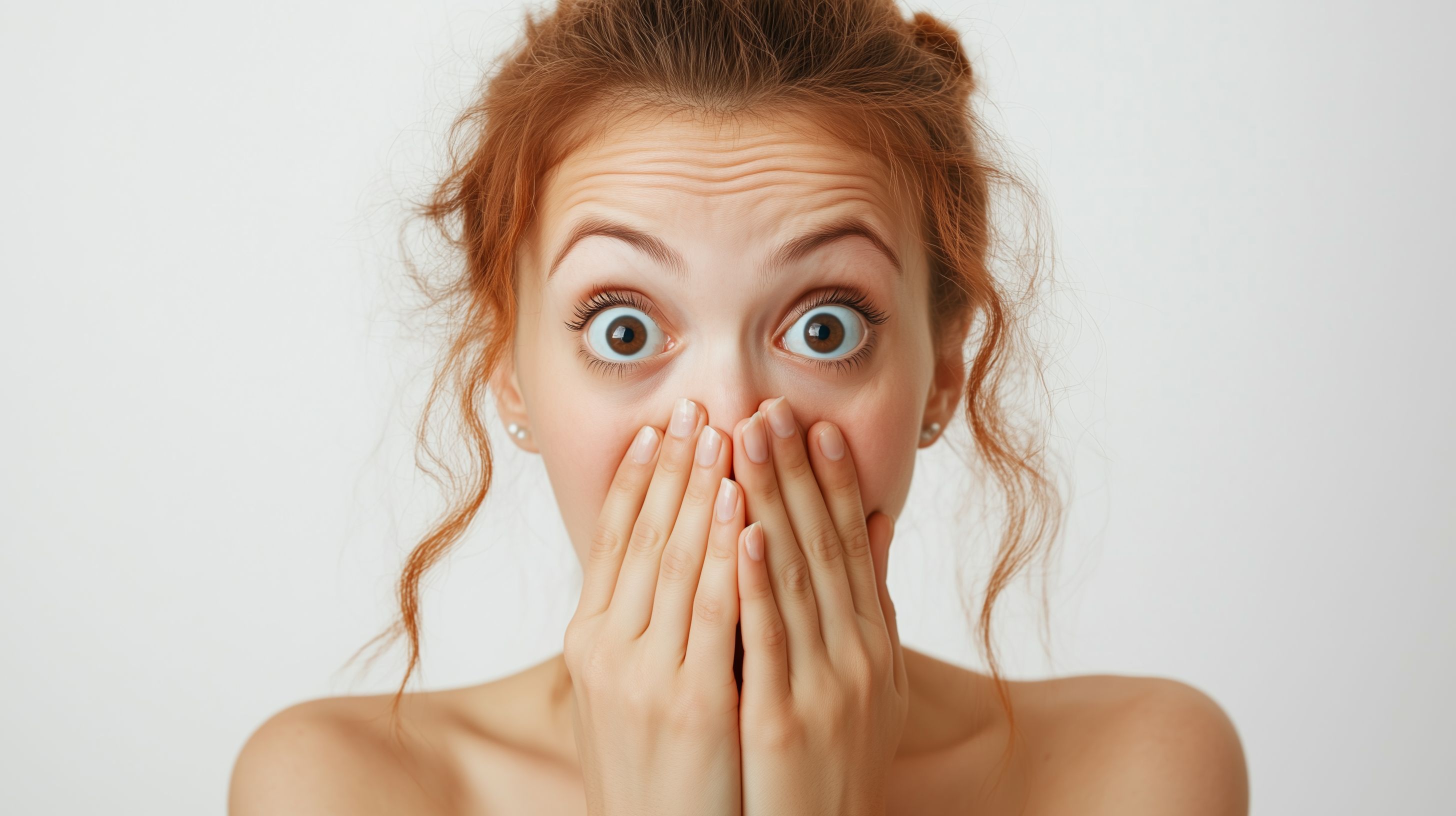 Das Bild zeigt eine junge Frau mit roten Haaren, die mit weit aufgerissenen Augen und vor dem Mund gelegten Händen überrascht wirkt. Der Hintergrund ist einfarbig weiß, so dass der Fokus ganz auf dem ausdrucksstarken Gesichtsausdruck der Frau liegt. Das Foto hat einen natürlichen, lebendigen Look und könnte gut als Titelbild für einen Blogbeitrag, Werbeanzeige oder Social-Media-Post verwendet werden. Als hochwertiges, kostenloses Stockfoto unter Creative-Commons-Lizenz eignet es sich hervorragend für verschiedenste Einsatzzwecke.