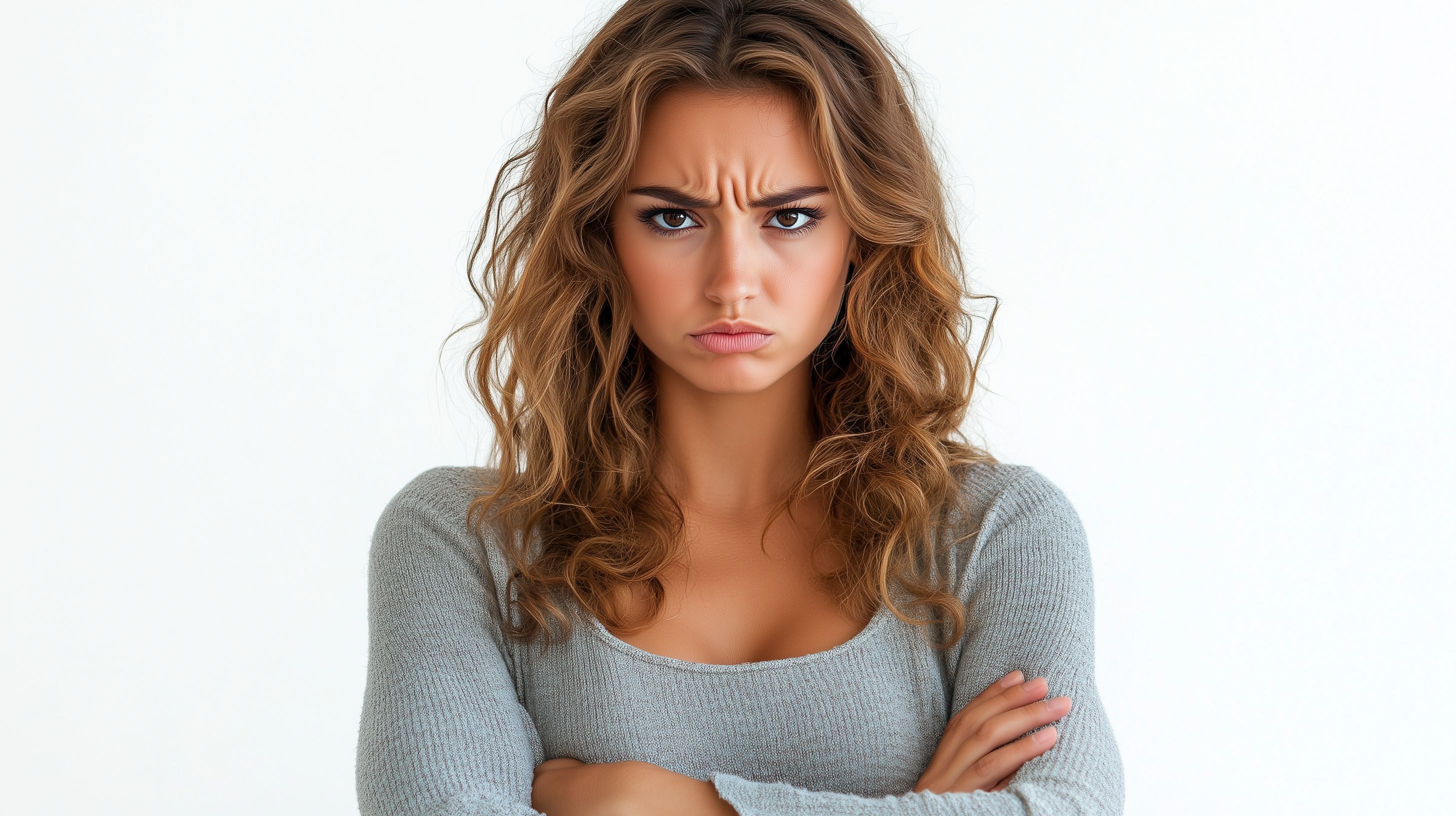 Das Bild zeigt eine junge Frau mit lockigem, braunem Haar, die einen genervten und gestressten Gesichtsausdruck hat. Sie hat die Arme verschränkt und blickt mit hochgezogener Augenbraue direkt in die Kamera. Das Foto wurde vor einem weißen Hintergrund aufgenommen und eignet sich hervorragend als Stockfoto für Beiträge zu Themen wie Stress, Frustration oder negative Emotionen. Die hohe Auflösung und Creative-Commons-Lizenz machen das Bild ideal für den Einsatz in Blogs, Newslettern, Social Media oder Werbung.