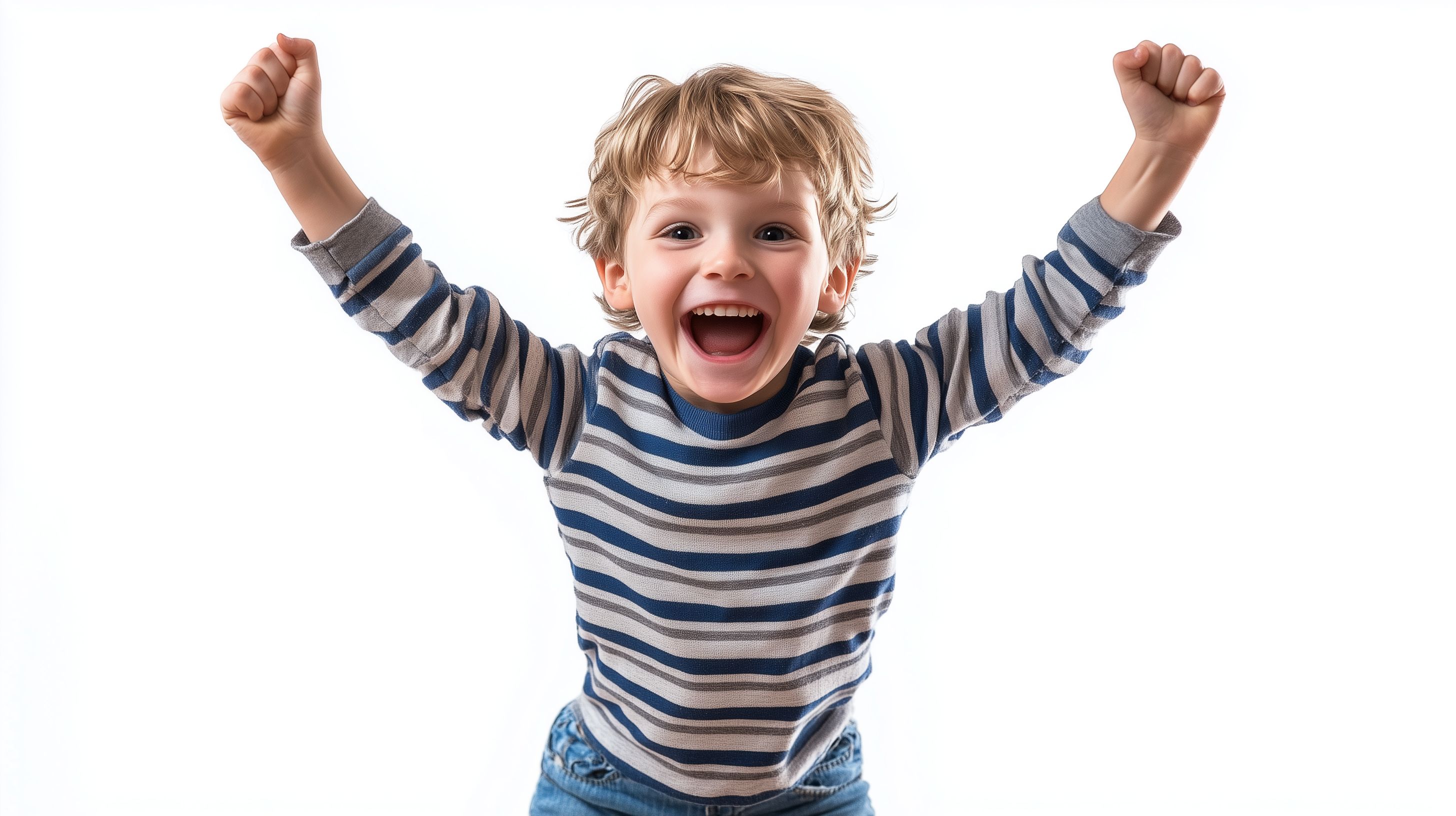 Das Foto zeigt einen fröhlichen jungen Jungen, der mit erhobenen Armen jubelnd vor Freude lacht. Er trägt ein gestreiftes Oberteil und strahlt über das ganze Gesicht. Der weiße Hintergrund lässt den Fokus ganz auf den Ausdruck des Kindes liegen und unterstreicht seine Begeisterung. Dieses lebendige und energiegeladene Stockfoto in hoher Auflösung eignet sich perfekt für den Einsatz in Blogs, Social-Media-Beiträgen, Newslettern oder Werbematerialien. Es ist unter einer Creative-Commons-Lizenz frei verfügbar.