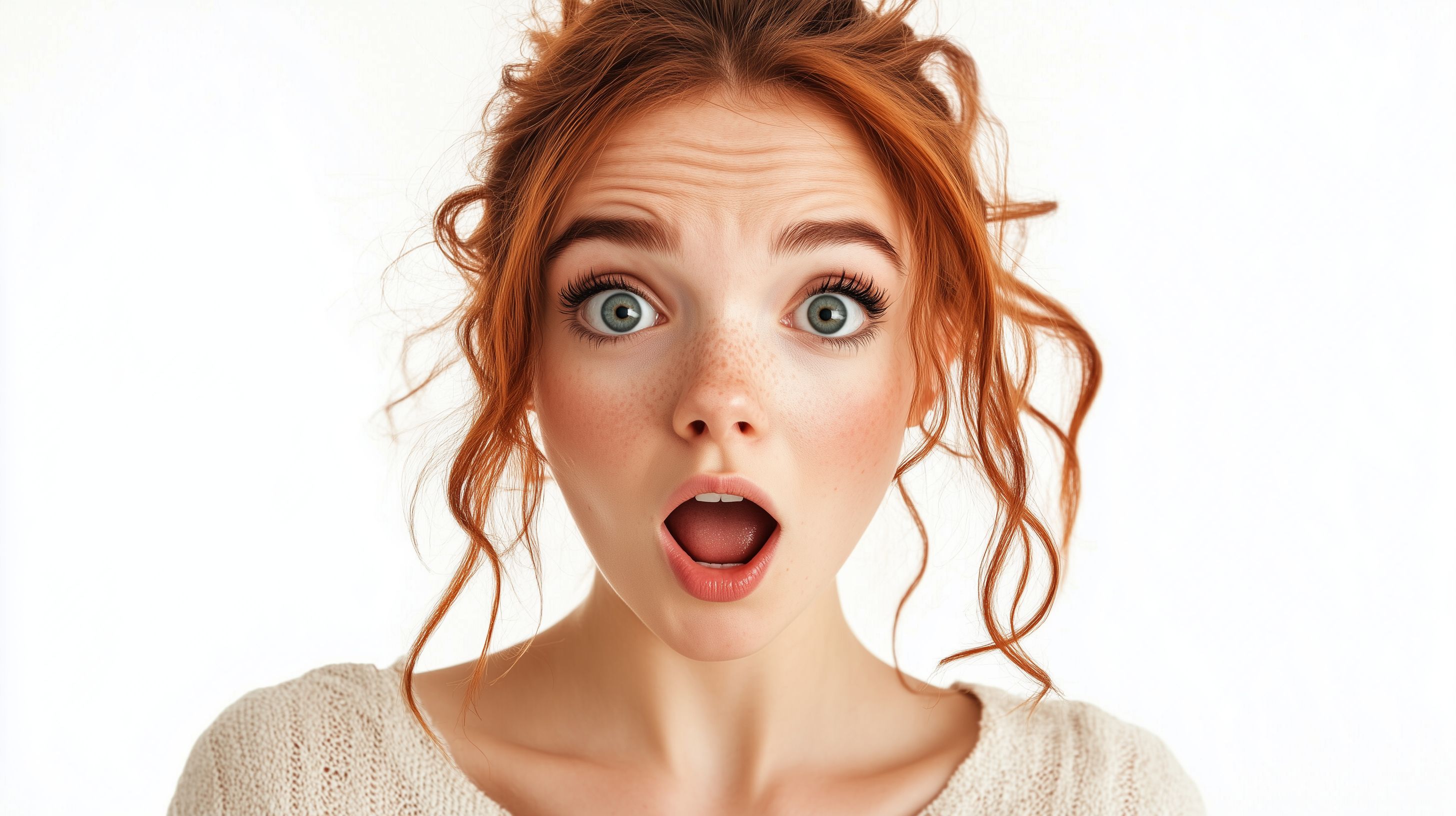 Das Bild zeigt eine junge Frau mit rotem, lockigem Haar und einem überraschten Gesichtsausdruck. Sie blickt direkt in die Kamera, ihre Augen sind weit aufgerissen und der Mund ist leicht geöffnet. Der Hintergrund ist weiß, sodass der Fokus voll und ganz auf dem Gesichtsausdruck liegt. Dieses Stockfoto eignet sich hervorragend für den Einsatz in Blogbeiträgen, Social-Media-Kampagnen oder Werbematerialien, in denen eine starke Emotion vermittelt werden soll. Es ist unter einer Creative-Commons-Lizenz verfügbar und in hoher Auflösung erhältlich.