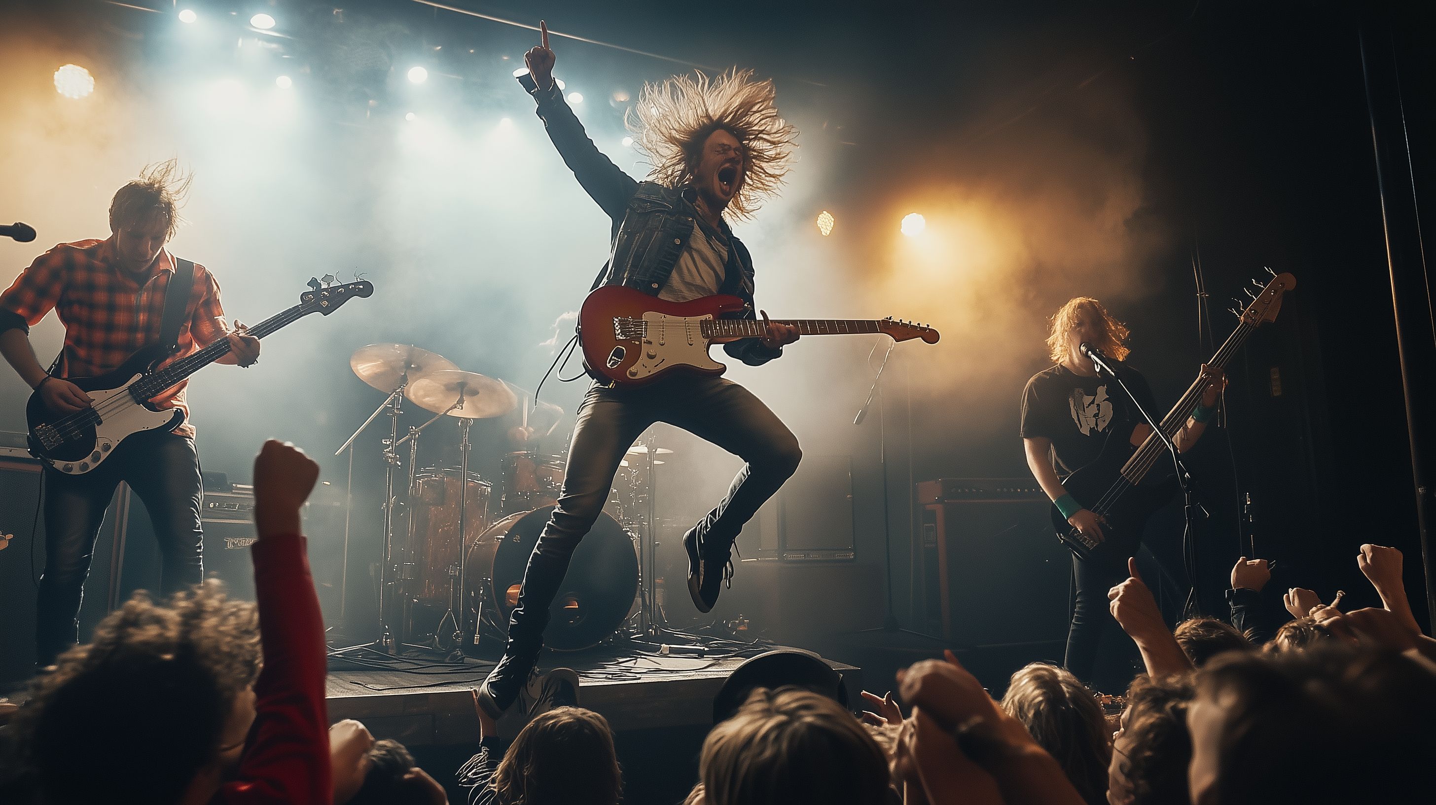 Das Foto zeigt eine energiegeladene Rockband bei einer mitreißenden Bühnenpräsenz. Auf der dunklen Bühne stehen vier Musiker, die sich voller Leidenschaft in ihre Performance stürzen. Der Sänger springt enthusiastisch in die Luft, sein langes Haar weht wild umher. Hinter ihm spielen zwei Gitarristen und ein Schlagzeuger mit hoher Konzentration ihre Instrumente. Im Hintergrund ist das begeisterte Publikum zu erkennen, das die Show sichtlich genießt. Die Atmosphäre ist geprägt von Dynamik, Authentizität und kreativer Freiheit - ein ideales Motiv für den Einsatz als kostenloses Stockfoto in hoher Auflösung für Blogs, Social Media-Posts oder Werbeanzeigen unter einer Creative Commons-Lizenz.