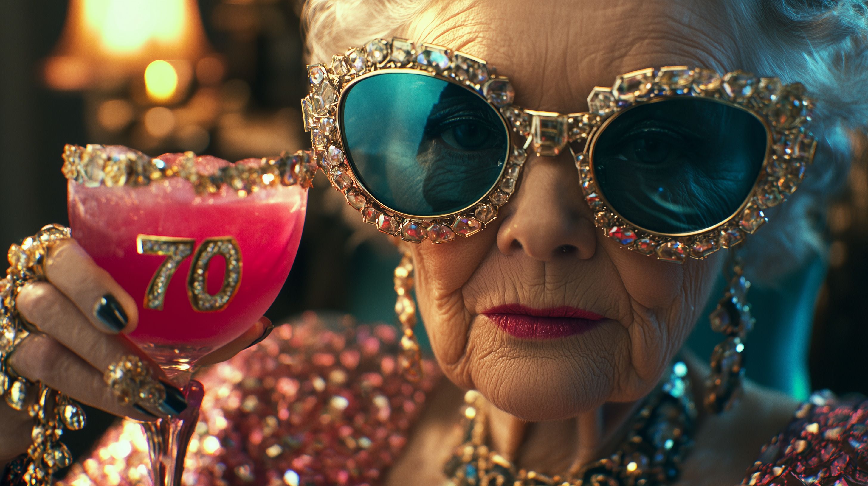 Dieses farbenfrohe Foto zeigt eine stilvolle ältere Dame, die offensichtlich ihren 70. Geburtstag feiert. Sie trägt eine auffällige, mit Glitzersteinchen verzierte Sonnenbrille und hält ein mit rosa Getränk gefülltes Glas in der Hand. Ihr Gesichtsausdruck strahlt Freude und Lebensfreude aus. Das Bild besticht durch seine leuchtenden Farben, die Nahaufnahme der Seniorin und die elegante, glamouröse Komposition. Es eignet sich hervorragend für den Einsatz in Blogs, Newslettern oder Werbematerialien zum Thema Geburtstag, Feiern, Älterwerden oder Eleganz im Alter. Als hochwertiges Stockfoto in kostenloser, frei nutzbarer Auflösung kann es für verschiedene kreative Projekte verwendet werden.