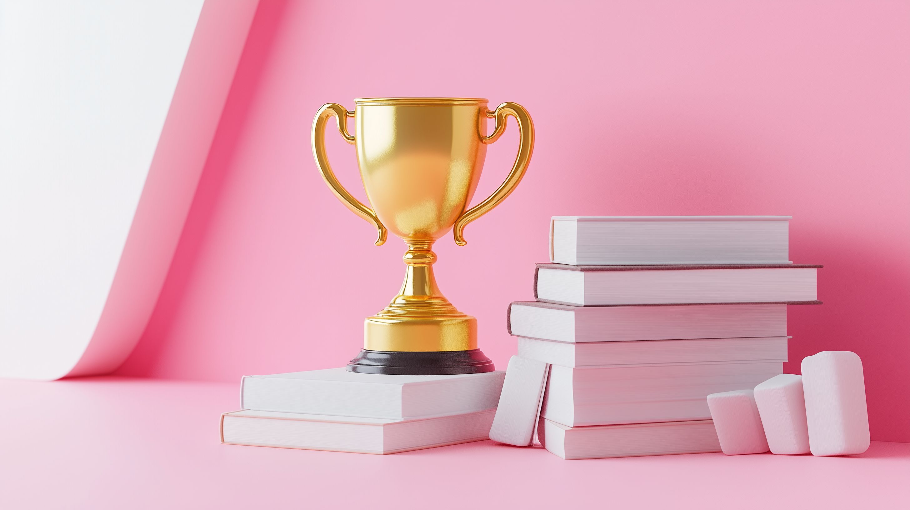 Das Bild zeigt einen glänzenden, goldenen Pokal, der auf einer rosafarbenen Oberfläche steht. Um den Pokal herum sind Bücher aufgestapelt, die ein Gefühl von Bildung und Wissen vermitteln. Die Kombination aus dem strahlenden Pokal und den schlichten, weißen Büchern erzeugt einen modernen und eleganten Gesamteindruck. Dieses Stockfoto eignet sich perfekt für die Verwendung in Blogs, Newsletters, Social-Media-Beiträgen oder Werbematerialien, die Erfolg, Leistung oder Bildung thematisieren. Das hochauflösende Bild steht unter einer Creative-Commons-Lizenz und kann somit kostenfrei verwendet werden.