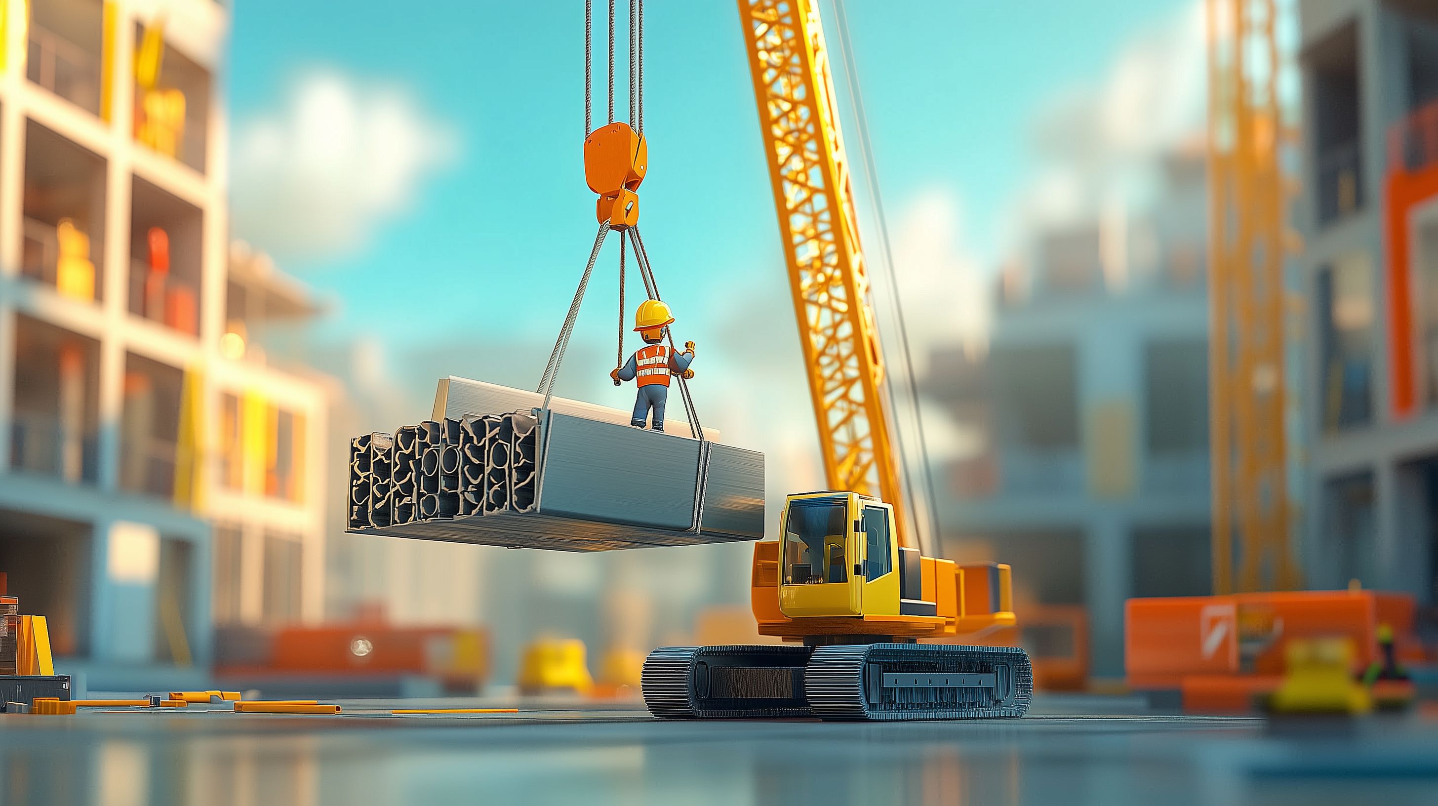 Dieses Stockfoto zeigt eine realistische 3D-Illustration einer Großbaustelle in einer städtischen Umgebung. Im Mittelpunkt steht ein mächtiger Kran, der gerade einen schweren Stahlträger hebt und auf eine Baustelle platziert. Rundherum sind weitere Baufahrzeuge und Ausrüstung zu sehen, die den industriellen Charakter der Szene unterstreichen. Die warme Farbpalette, der bewölkte Himmel und die markanten Gebäude im Hintergrund schaffen eine lebendige und authentische Atmosphäre.