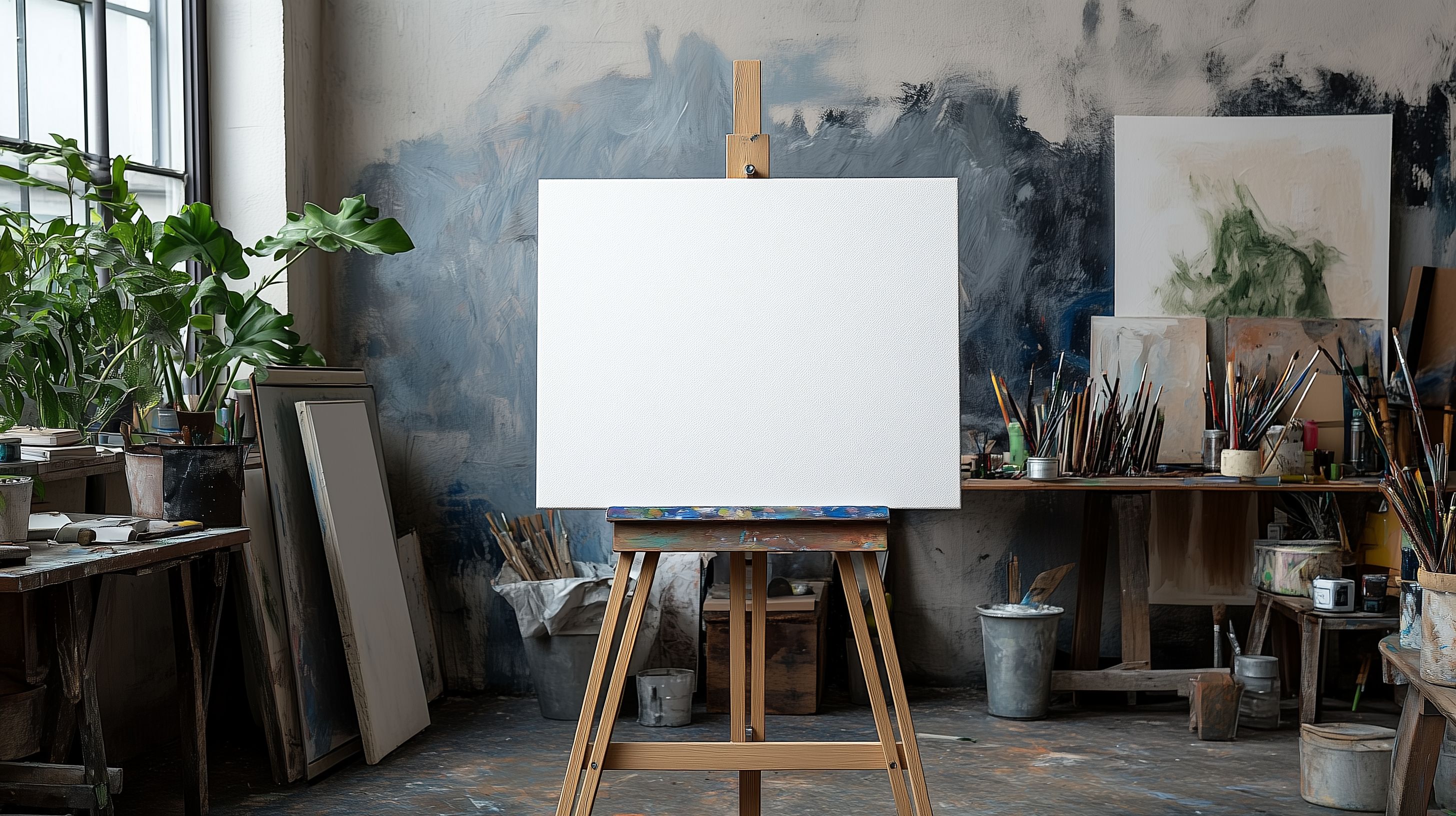 Das Bild zeigt ein kreatives Künstleratelier mit einer leeren weißen Leinwand auf einer Holzstaffelei. Im Hintergrund sind Wände in dunklen, abstrakten Farbtönen zu sehen. Verschiedene Malutensilien wie Pinsel, Farbtuben und Becher stehen auf Regalen und Arbeitsflächen. Das Arrangement vermittelt einen inspirierenden und authentischen Eindruck eines Ateliers, in dem künstlerische Werke entstehen. Das Foto eignet sich ideal als kostenloses Stockfoto für Blogs, Newsletter oder Werbematerialien mit Bezug zu Kreativität, Malerei und Künstlerarbeit. Die hochauflösende Datei steht unter einer Creative-Commons-Lizenz zur freien Nutzung zur Verfügung.