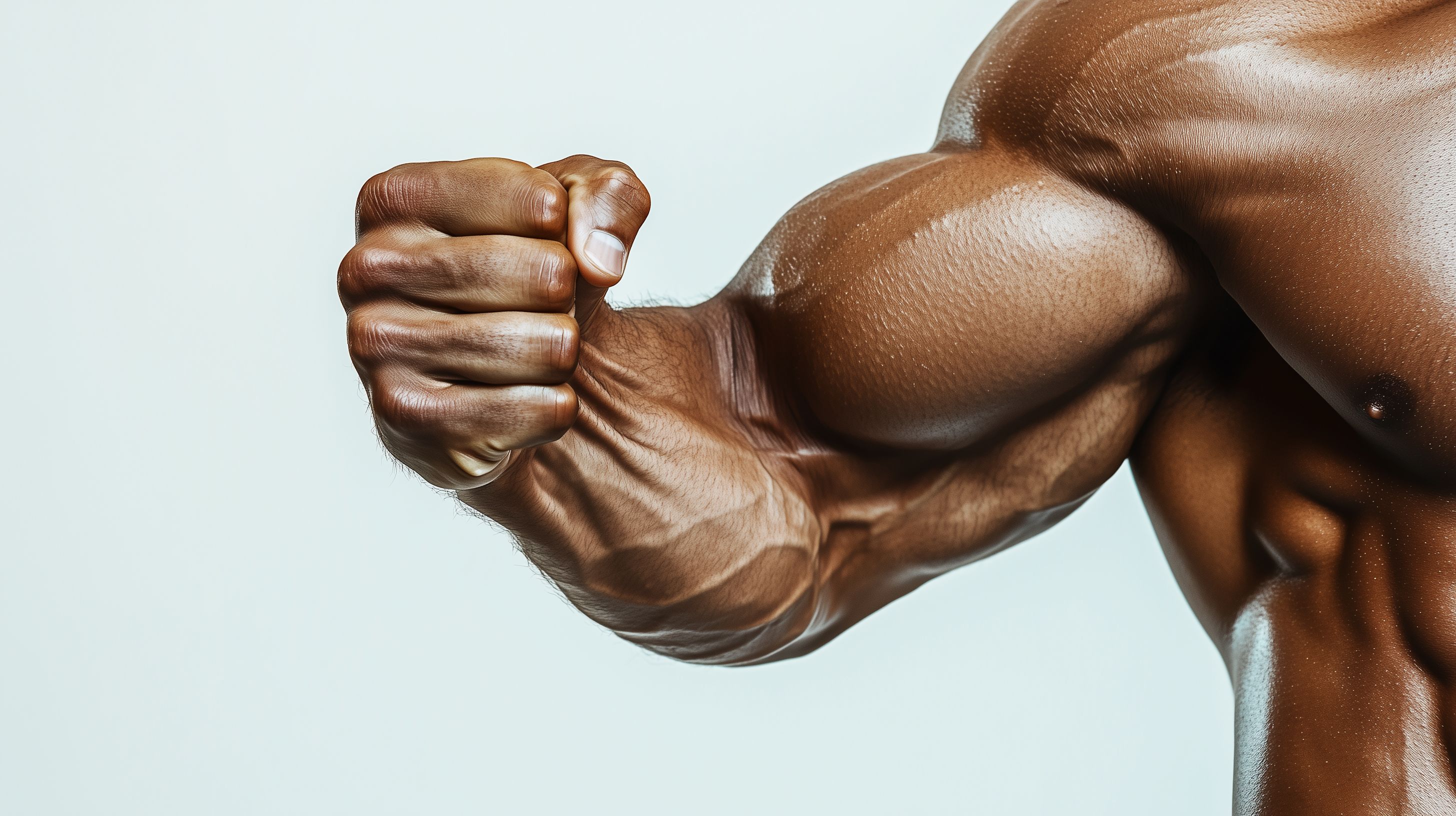 Das Bild zeigt einen kraftvollen, muskulösen Oberarm und eine geballte Faust vor einfarbigem Hintergrund. Der Fokus liegt auf der detaillierten Muskulatur und den Sehnen des Bizeps, die durch die Anspannung deutlich hervortreten. Dieses Stockfoto eignet sich hervorragend für Designs, Werbungen oder Illustrationen rund um Themen wie Fitness, Sport, Gesundheit und Leistungsfähigkeit. Die hohe Auflösung und der kreative, minimalistische Stil machen es zu einem vielseitig einsetzbaren, kostenlosen Bildmaterial unter Creative-Commons-Lizenz.