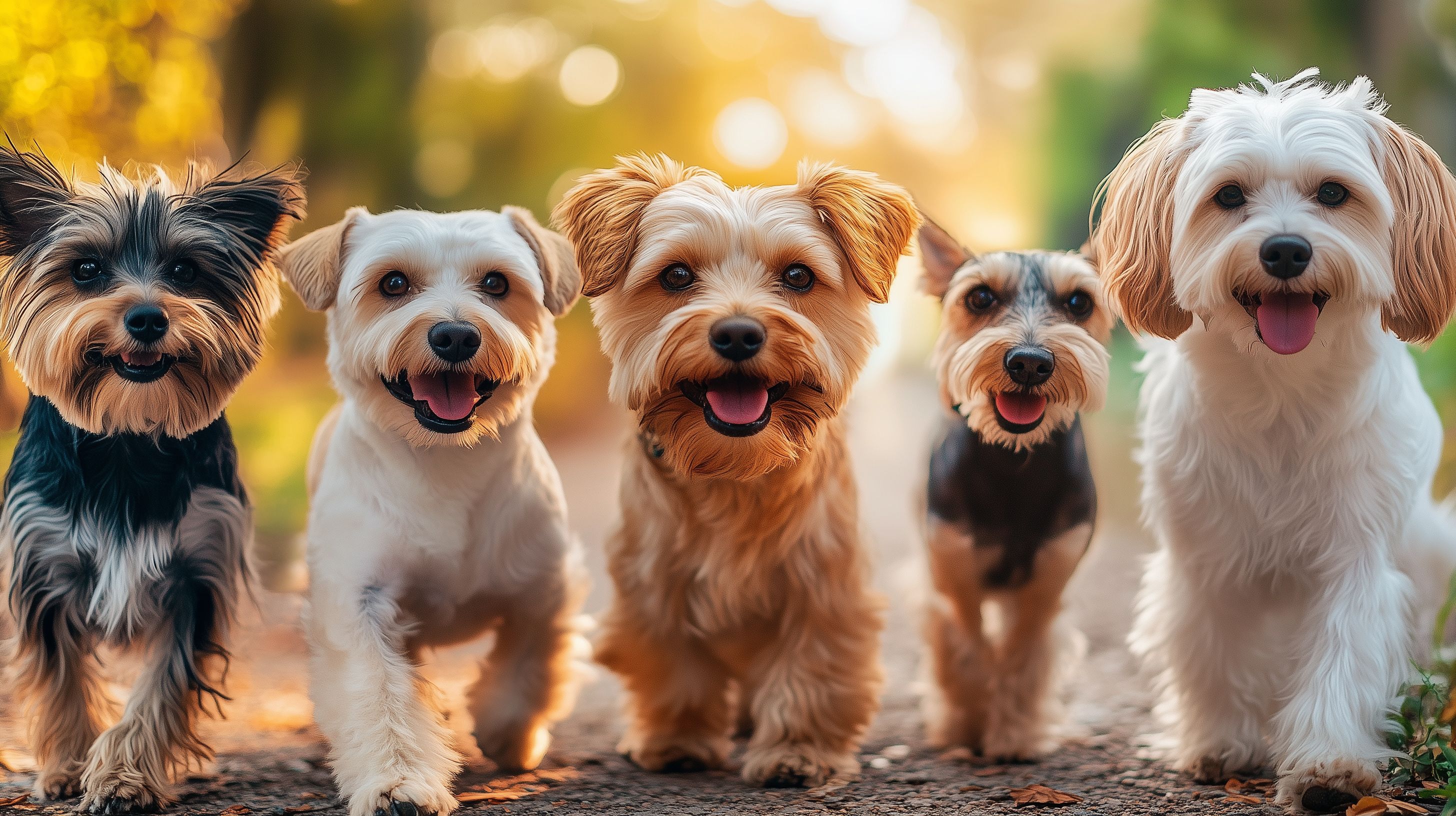 Dieses bezaubernde Foto zeigt eine Gruppe von fünf fröhlichen Hunden, die auf einem Waldpfad im Abendlicht spazieren. Die Hunde, darunter verschiedene Rassen wie Yorkshire Terrier, Malteser und Pudel, scheinen einen wunderbaren Tag im Freien zu genießen. Ihre glücklichen Gesichter und schwanzwedelnden Bewegungen vermitteln eine Stimmung von Lebensfreude und Unbeschwertheit.