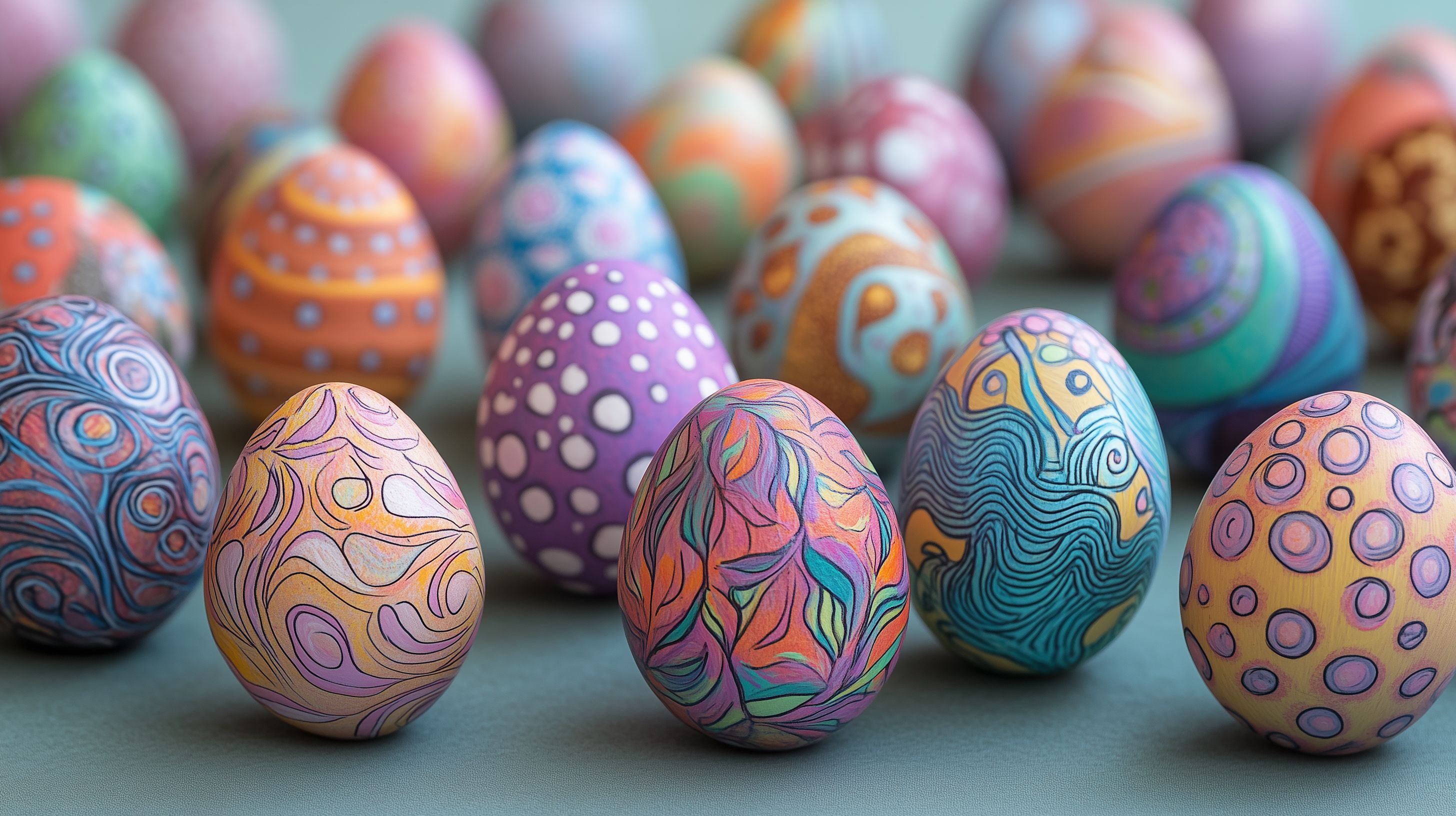 Dieses Bild zeigt eine Vielzahl von fantasievoll gestalteten Ostereiern in sanften Pastelltönen. Die Eier sind mit detaillierten, handgemalten Mustern und Designs dekoriert, die an bunte Mandalas, abstrakte Formen und fließende Linien erinnern. Die Farbpalette umfasst zarte Nuancen von Rosa, Lila, Blau, Grün und Orange, die eine harmonische, frühlingsfrohe Atmosphäre schaffen. Dieses Foto eignet sich hervorragend als kostenloses Stockfoto für Oster-Dekorationen, Frühlingskampagnen, Blog-Beiträge oder kreative Social-Media-Inhalte in hoher Auflösung und unter der Creative-Commons-Lizenz.