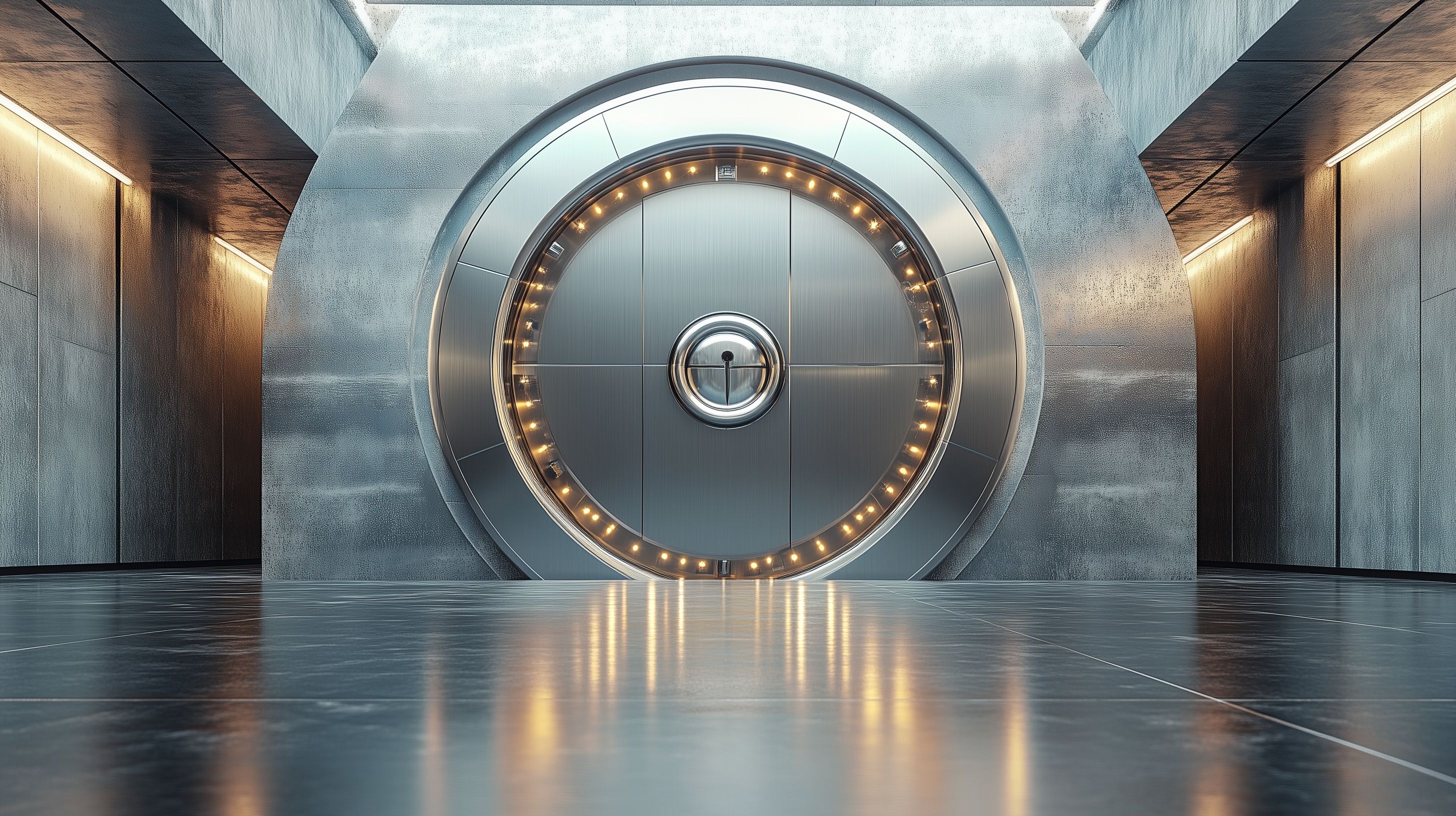 Dieses Bild zeigt den Eingangsbereich eines modernen Bankgewölbes mit einem großen, runden Hochsicherheitstresor in der Mitte. Die Tür des Tresors ist aus poliertem Stahl und mit einer Reihe von Lampen beleuchtet, die einen beeindruckenden, futuristischen Eindruck vermitteln. Der Boden ist ebenfalls aus dunklem Stein, der das Licht reflektiert und eine opulente, luxuriöse Atmosphäre schafft. Dieses Foto eignet sich hervorragend für den Einsatz in Artikeln, Blogbeiträgen oder Werbematerialien, die sich mit Finanzthemen, Sicherheit oder Luxus befassen. Als kostenloses Stockfoto in hoher Auflösung unter einer Creative-Commons-Lizenz ist es für verschiedenste Zwecke verwendbar.