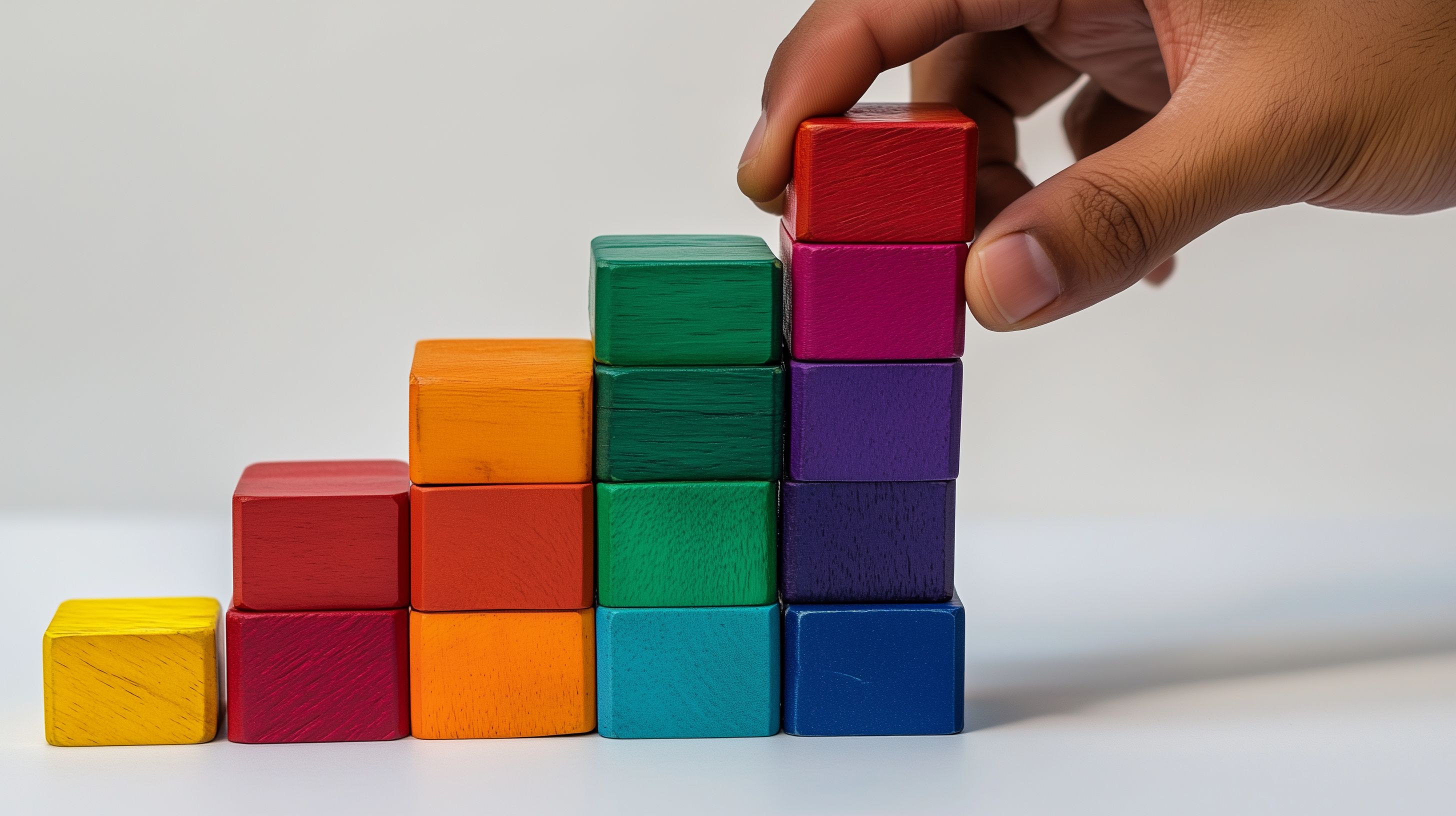Das Bild zeigt eine Reihe bunter Holzwürfel, die in aufsteigender Größe gestapelt sind. Die Würfel sind in den Farben Rot, Orange, Gelb, Grün, Blau und Lila angeordnet, was eine harmonische und ästhetisch ansprechende Farbkomposition ergibt. Die Perspektive des Fotos lässt den Betrachter die Würfel von oben sehen, was den Eindruck von Ordnung und Struktur verstärkt.