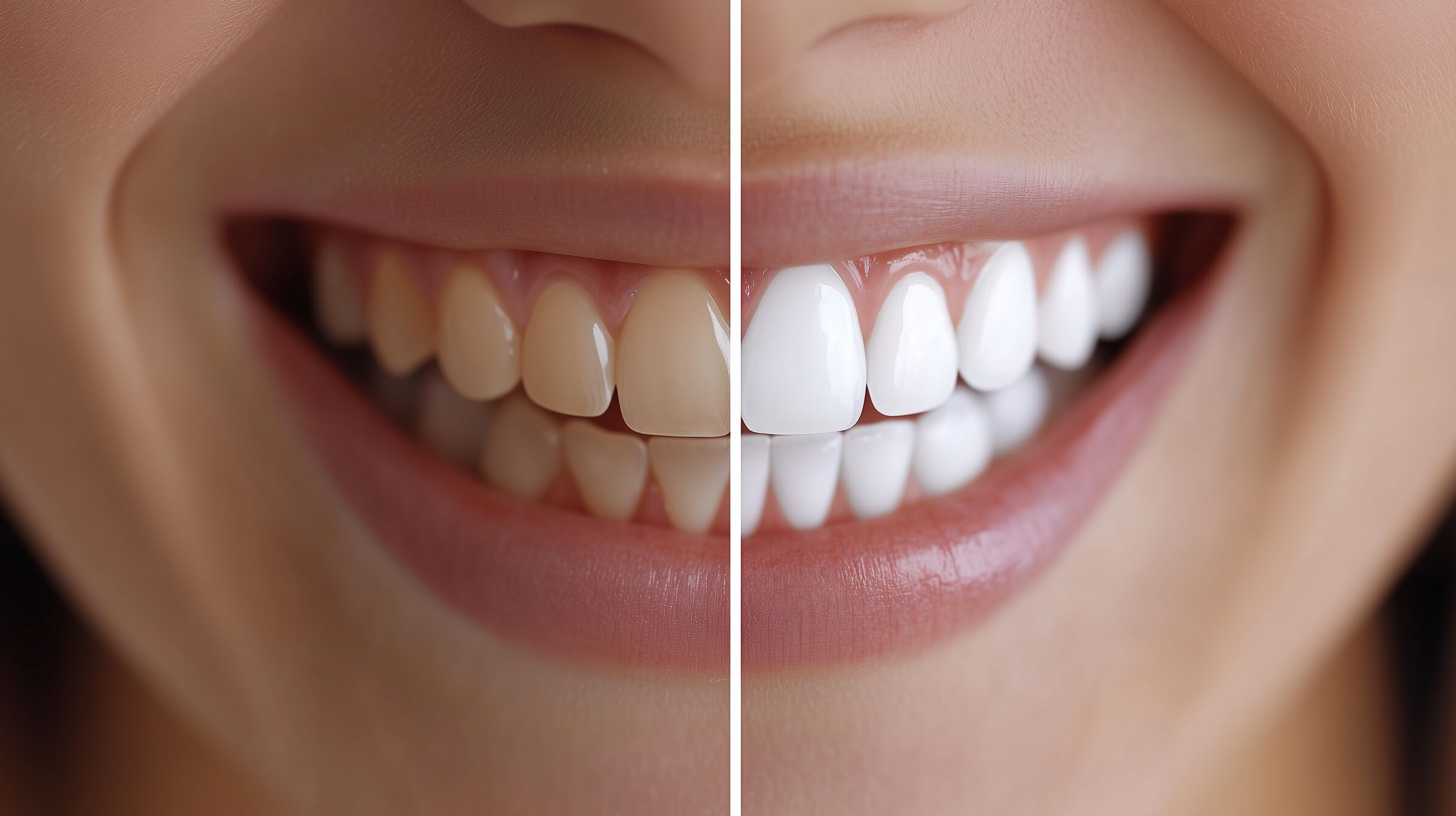 Das Bild zeigt den Vergleich von Zähnen vor und nach einer Zahnaufhellung. Auf der linken Seite sind leicht verfärbte, gelbliche Zähne zu sehen. Auf der rechten Seite präsentieren sich hingegen strahlend weiße und perfekt gerade Zähne. Das Bild eignet sich hervorragend für Beiträge und Werbung rund um das Thema Zahnhygiene, Gesundheit und Schönheit. Als hochwertiges Stockfoto unter Creative-Commons-Lizenz kann es in verschiedensten Kontexten wie Blogbeiträgen, Newslettern oder Social-Media-Posts eingesetzt werden.