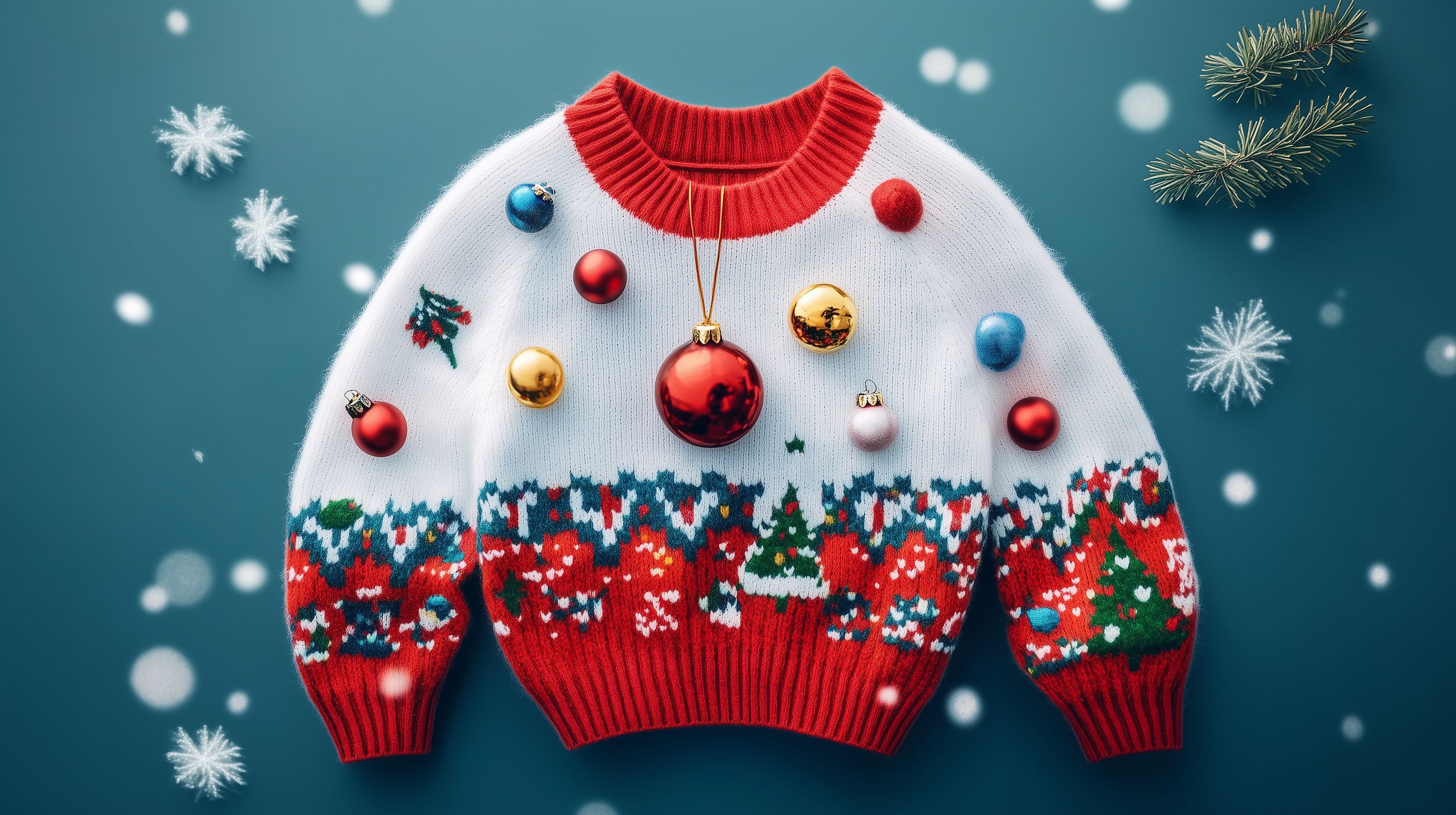 Dieses Foto zeigt einen detaillierten Weihnachtspullover mit einem ikonischen, festlichen Design. Der Strickpullover ist in einem klassischen Rot-Weiß-Farbschema gehalten und mit verschiedenen Christbaumkugeln, Schneeflocken und anderen Weihnachtsmotiven verziert. Die Kombination aus dem gemütlichen Strickmuster und den bunten, leuchtenden Akzenten schafft eine winterliche, weihnachtliche Atmosphäre. Dieses Stockfoto eignet sich hervorragend für weihnachtliche Marketing-Kampagnen, Printmedien wie Magazine und Broschüren oder digitale Kanäle wie Websites, Newsletter und Social Media. Es ist in hoher Auflösung verfügbar und kann unter einer Creative-Commons-Lizenz kostenlos verwendet werden.