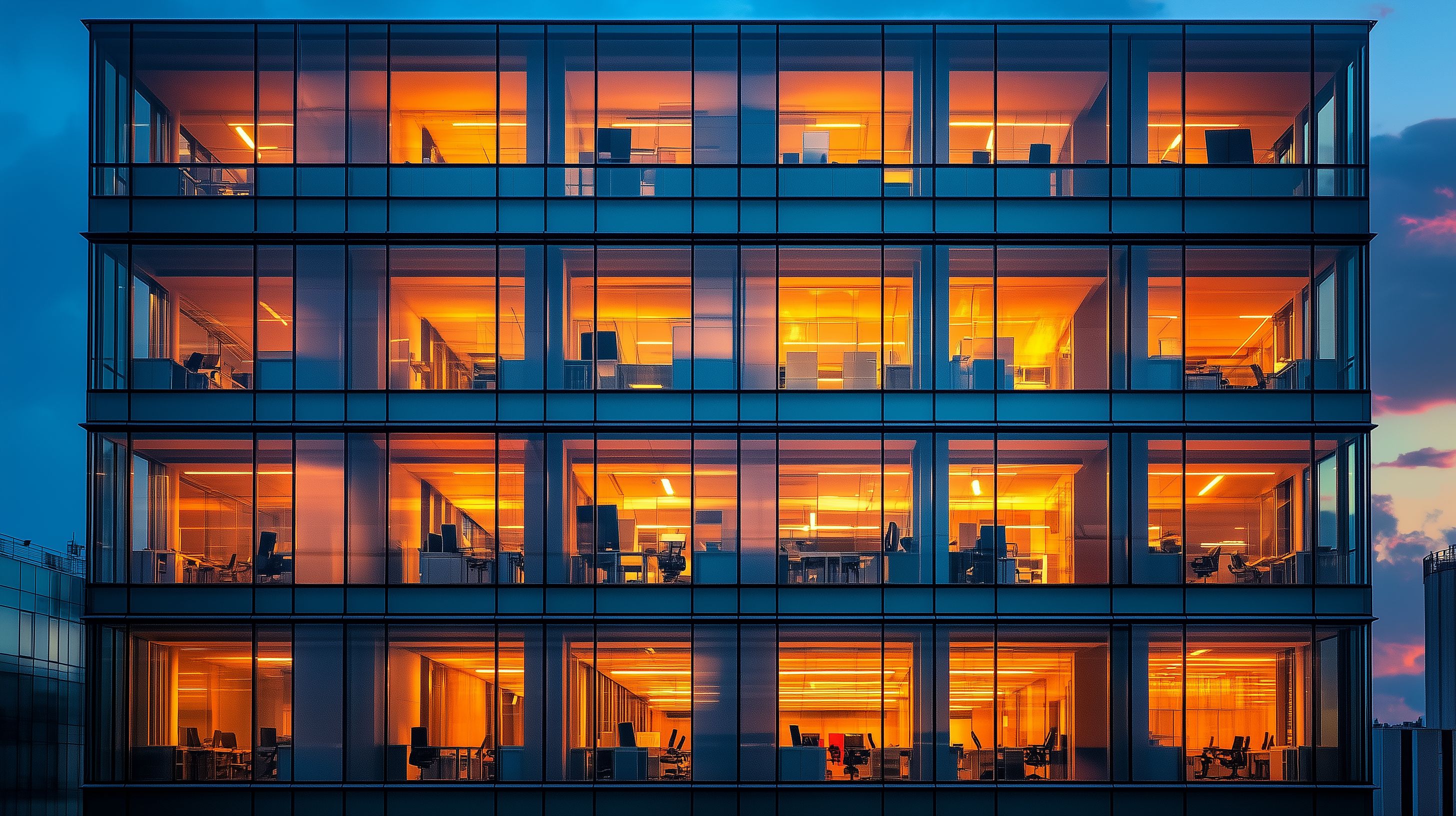 Modernes Bürogebäude mit beleuchteten Fenstern bei Sonnenuntergang von Marco Verch unter Creative Commons 2.0