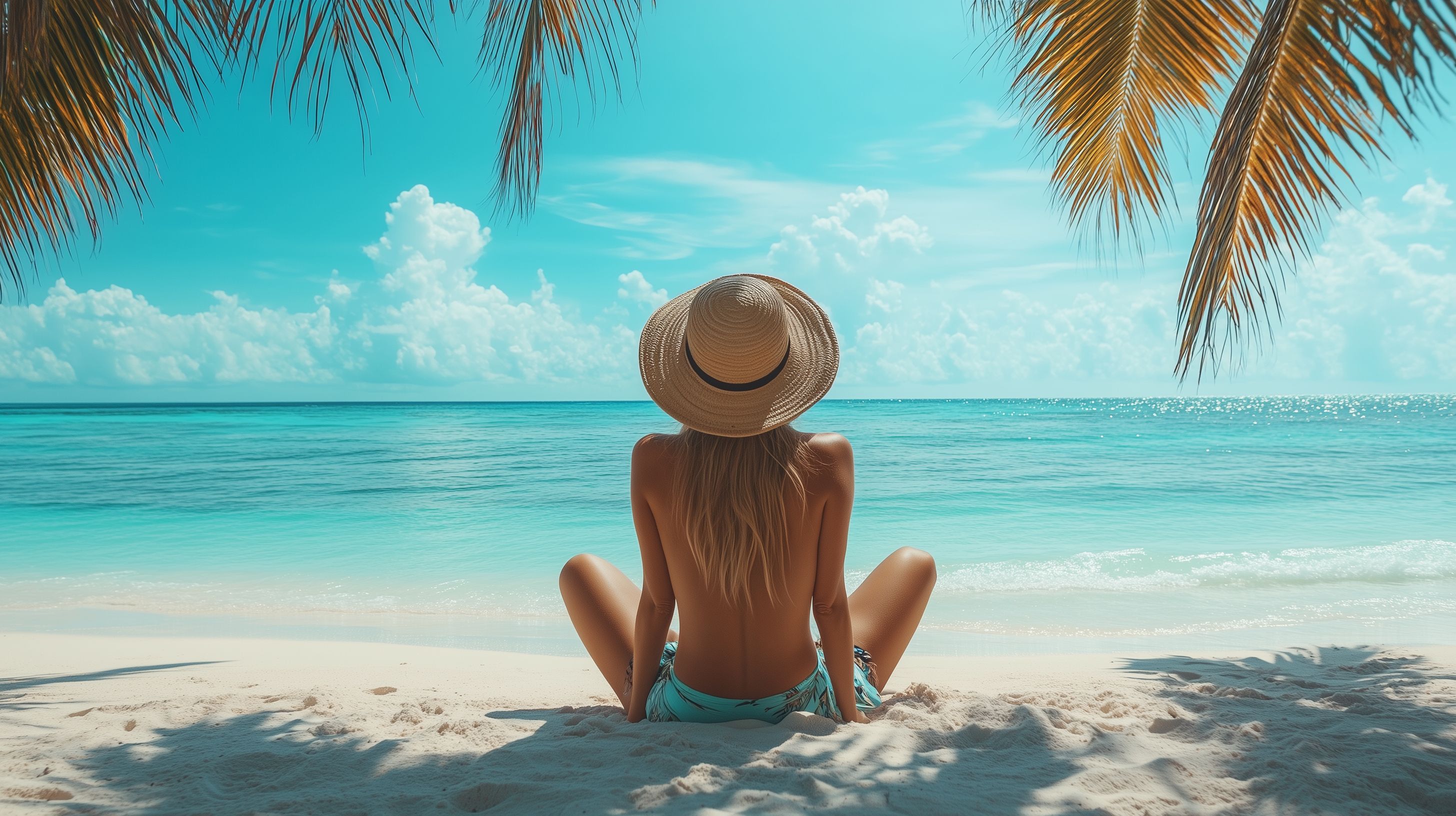 Das Foto zeigt eine entspannte Frau, die an einem traumhaften, tropischen Strand sitzt und den Blick aufs Meer genießt. Im Vordergrund ist die Rückansicht der Person zu sehen, die einen breiten Strohhut trägt und in einem türkisfarbenen Bikini bekleidet ist. Im Hintergrund erstreckt sich eine wunderschöne Szenerie mit kristallklarem Wasser, weißem Sand und Palmen, die sich im Wind bewegen. Die Stimmung ist friedlich und einladend, vermittelt Sommerfrische und Erholung.