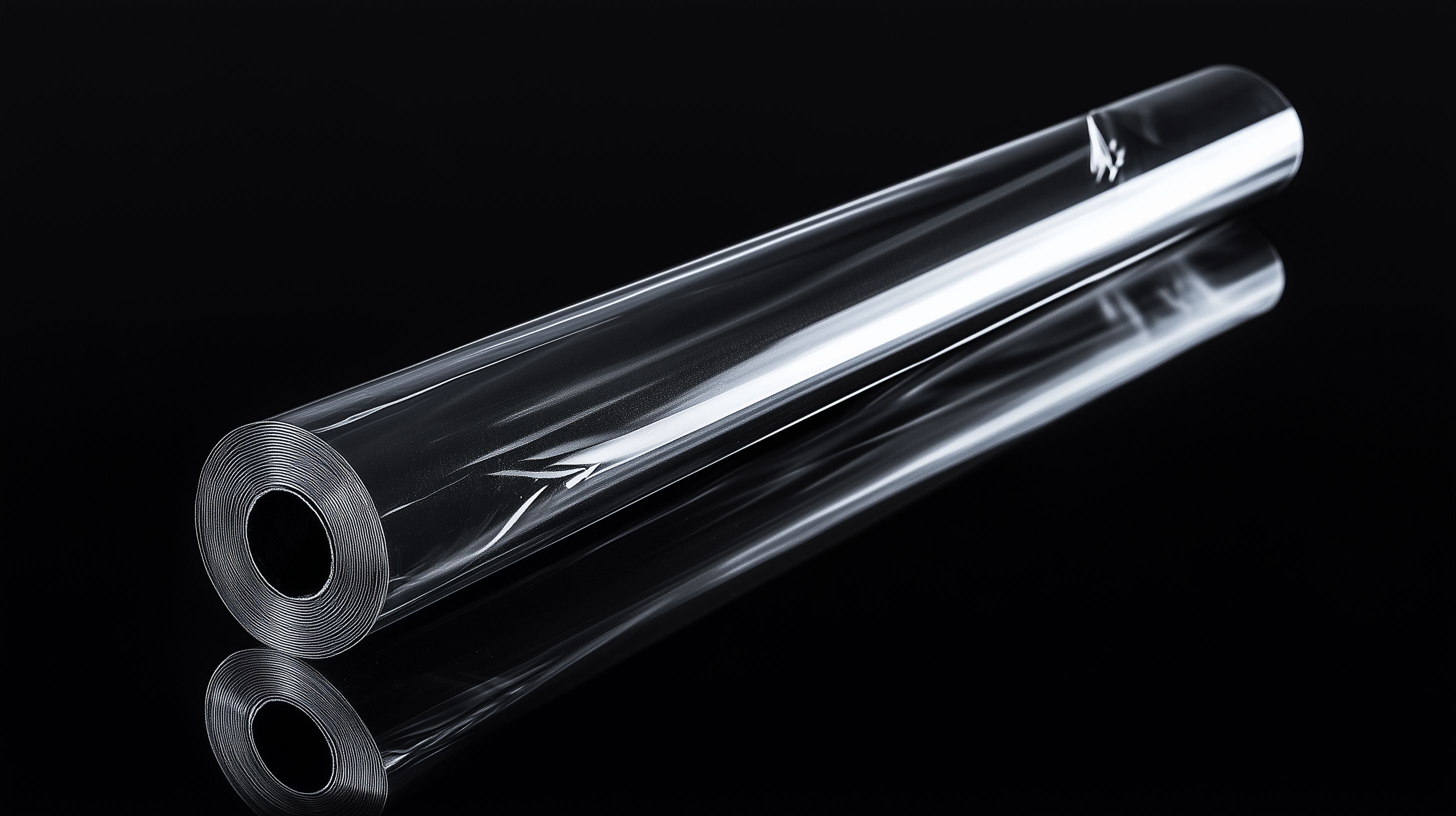 Das Bild zeigt eine Rolle transparenter Folie oder Kunststofffolie vor einem komplett schwarzen Hintergrund. Die Folie liegt in leichter Kurve auf der Oberfläche und fängt etwas Licht ein, wodurch ein grafisches, minimalistisches Motiv entsteht. Die hohe Kontraststärke und der tiefschwarze Hintergrund lassen die transparente Folie besonders klar und deutlich hervortreten.