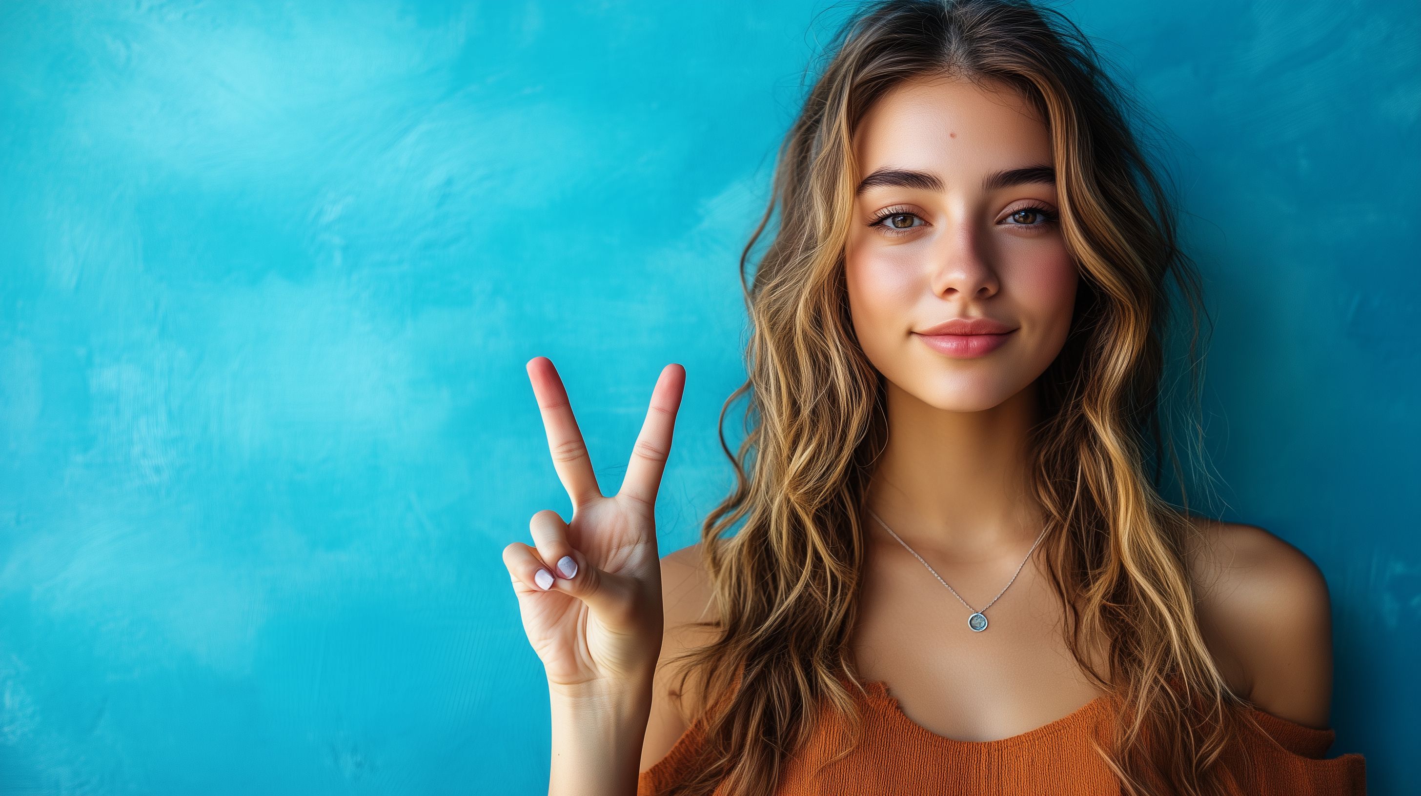 Das Bild zeigt eine junge, selbstbewusst wirkende Frau mit langen, lockigen Haaren vor einer leuchtend blauen Wand. Sie lächelt in die Kamera und formt mit ihrer Hand das Friedenszeichen, eine ikonische Geste, die Frieden, Harmonie und Optimismus symbolisiert. Das Foto strahlt eine positive, fröhliche Stimmung aus und kann für verschiedene Anwendungen wie Blogs, Newsletter, Social-Media-Posts oder Werbung eingesetzt werden. Als hochauflösendes Stockfoto unter einer Creative-Commons-Lizenz steht es kostenlos zur Verfügung.