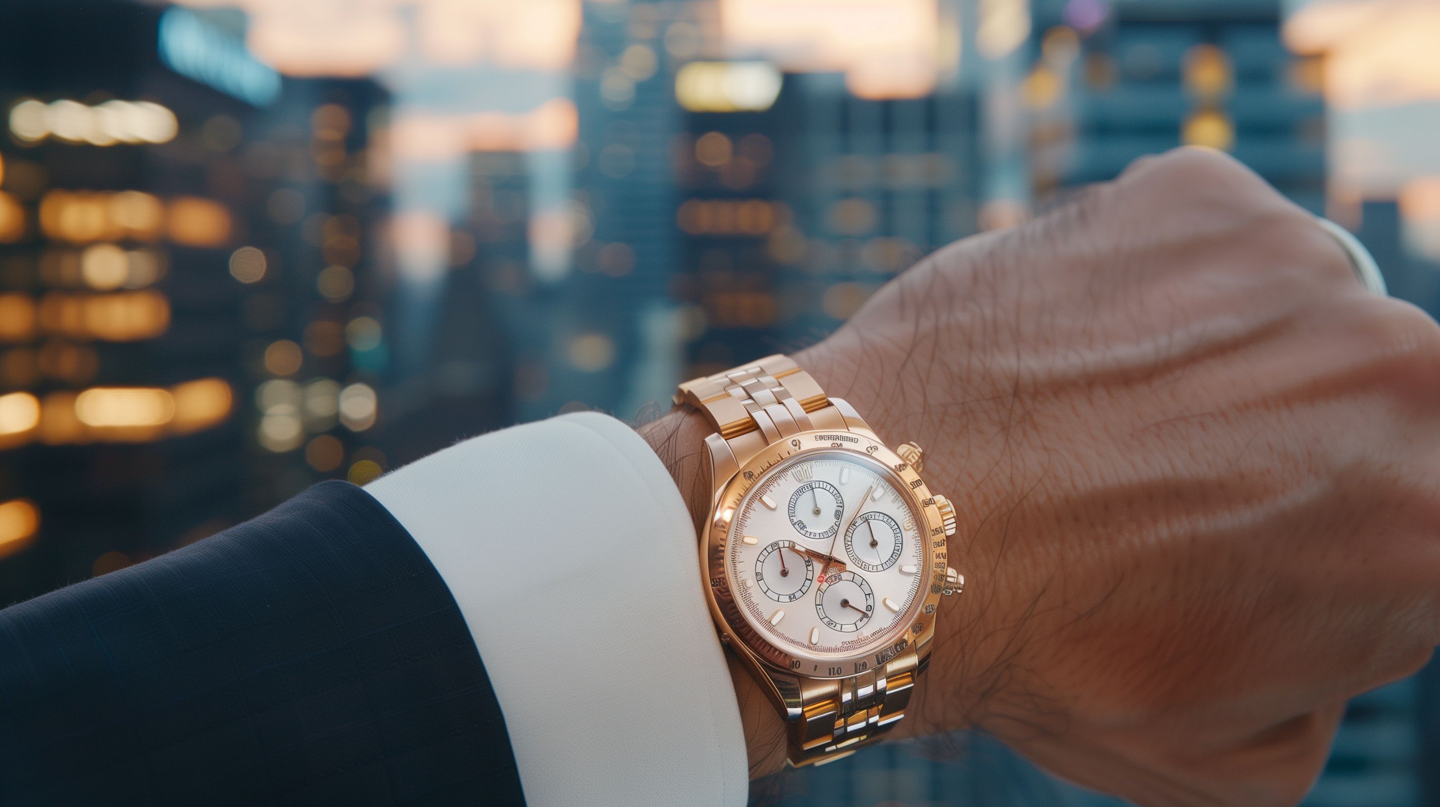 Das Bild zeigt eine hochwertige, elegante Armbanduhr, die an einem Handgelenk in einem Anzug getragen wird. Der Hintergrund zeigt eine urbane Skyline bei Nacht, mit beleuchteten Hochhäusern, die einen stimmungsvollen Kontrast zur Uhr bilden. Dieses Foto eignet sich hervorragend als Stockfoto für Werbe- und Marketingmaterialien in Branchen wie Wirtschaft, Finanzen oder Mode. Es vermittelt Luxus, Erfolg und urbanes Flair. Dieses hochauflösende Foto steht unter einer Creative-Commons-Lizenz zur kostenlosen Verwendung zur Verfügung.