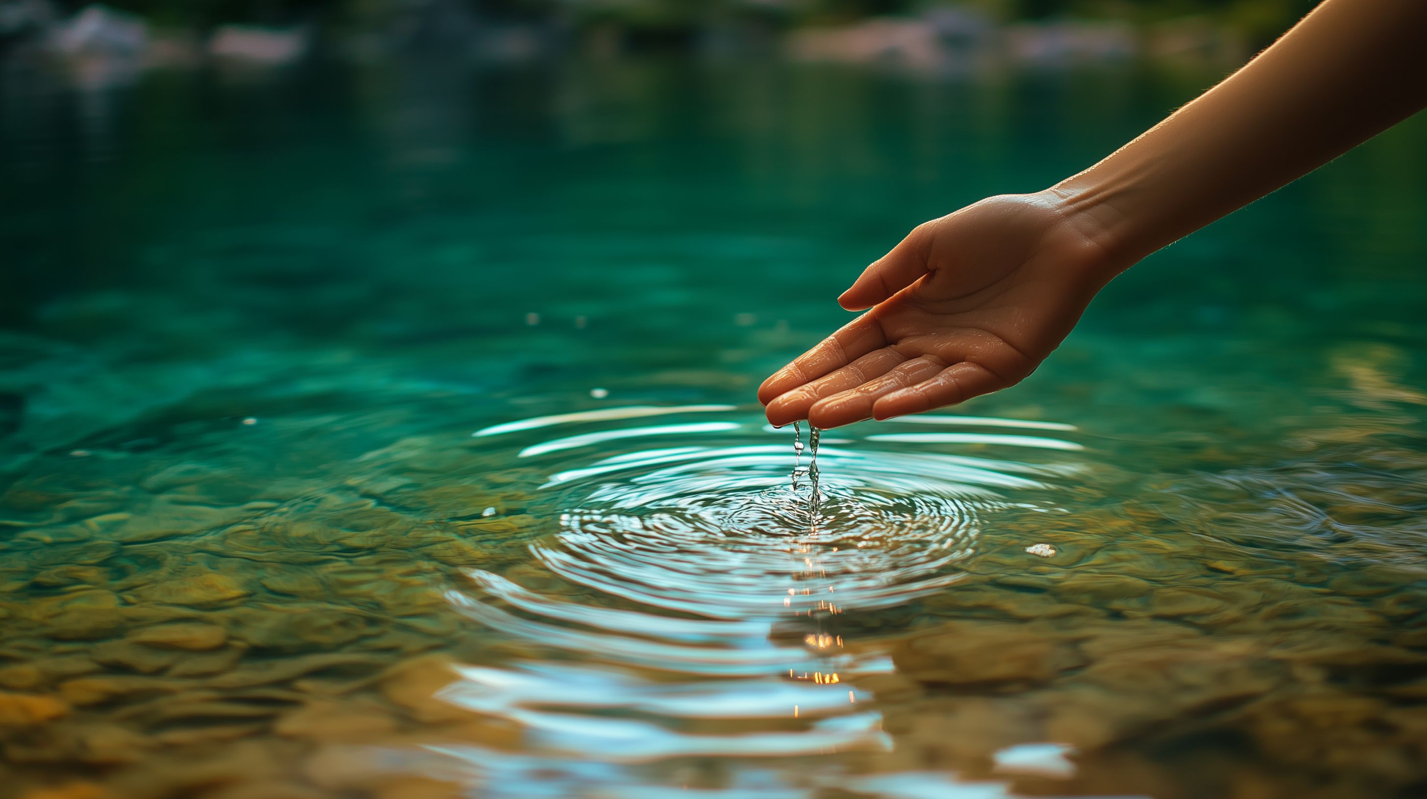 Das Foto zeigt eine nahaufnahme einer Hand, die das Wasser eines kristallklaren, smaragdgrünen Sees berührt. Die Oberfläche des Wassers ist wie ein Spiegel und zeigt eine perfekte Reflexion der umgebenden Natur. Die Bewegung der Hand erzeugt kleine Wellen, die sich in sanften Kreisen ausbreiten. Das Bild vermittelt eine Stimmung von Ruhe, Entspannung und Verbundenheit mit der Natur. Es eignet sich hervorragend als kostenloses Stockfoto für Blogs, Social-Media-Posts, Werbeanzeigen oder andere visuelle Inhalte in hoher Auflösung und unter der Creative-Commons-Lizenz.
