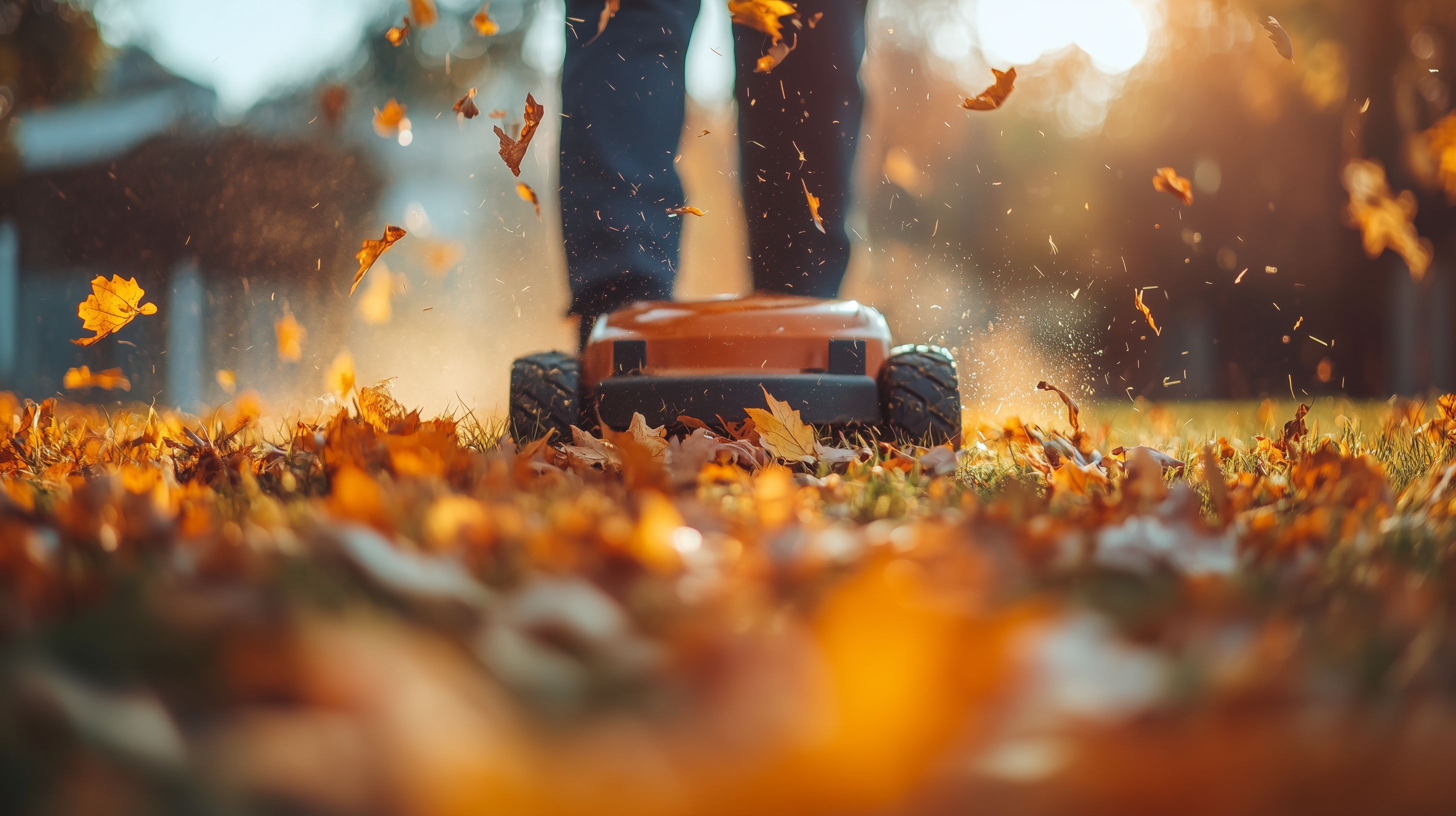Das Bild zeigt einen elektrischen Rasenmäher, der durch eine herbstliche Landschaft fährt. Auf dem Boden liegt eine Schicht bunter Laubblätter, die vom Morgennebel leicht befeuchtet sind. Die Sonne bricht durch die Wolken und taucht die Szene in ein warmes, oranges Licht. Der Rasenmäher hinterlässt seine Spuren im Laub und sorgt für einen gepflegten Garten.