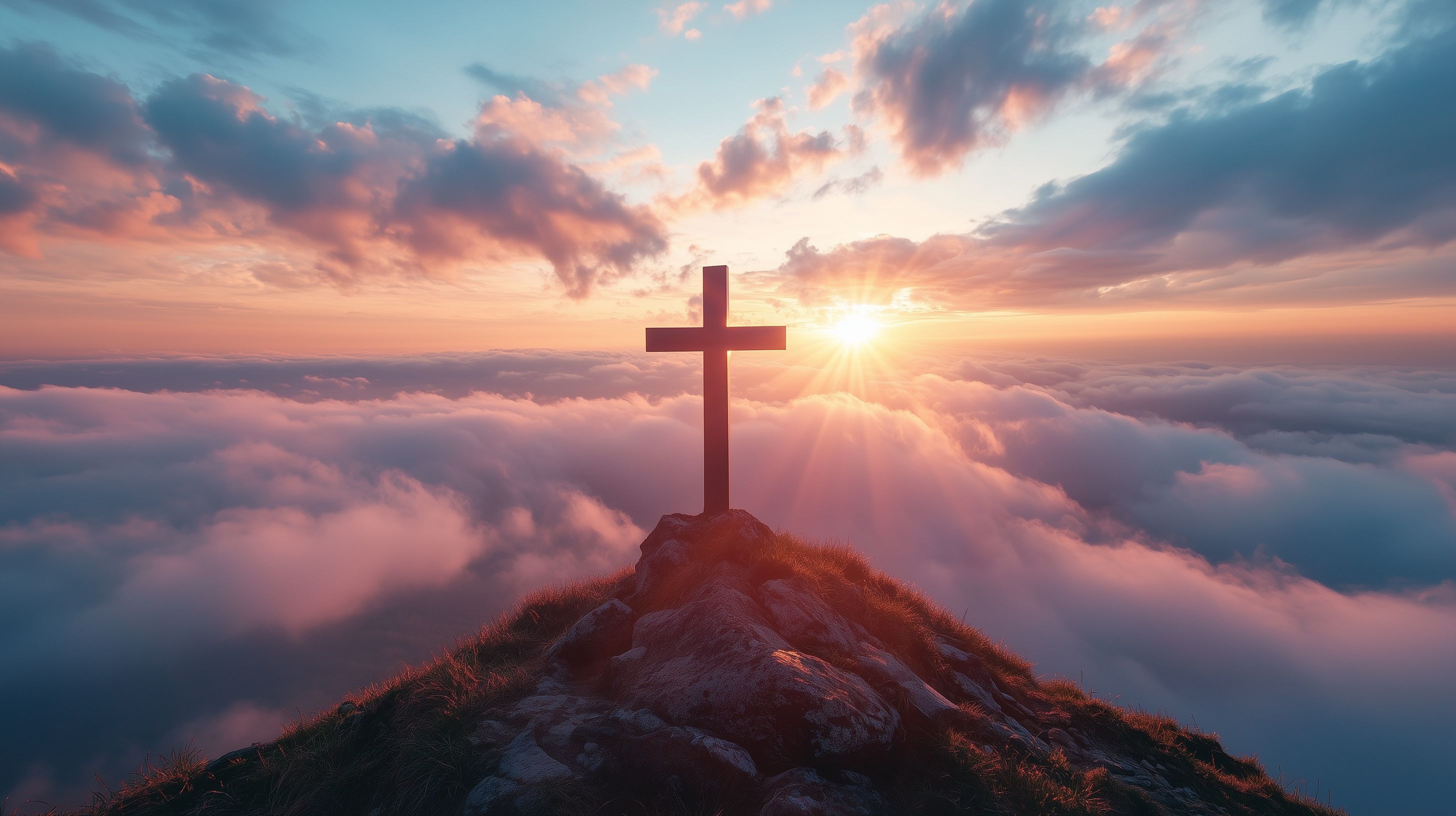 Das Bild zeigt eine eindrucksvolle Szene: Ein großes, dunkles Kreuz ragt auf der Spitze eines Berges empor, umgeben von einem spektakulären Sonnenuntergang. Der Himmel ist in ein warmes, orangerotes Licht getaucht, während Wolken in der Ferne dahinziehen. Das Kreuz steht symbolhaft für den christlichen Glauben und die Spiritualität, die durch die erhabene Berglandschaft unterstrichen wird.