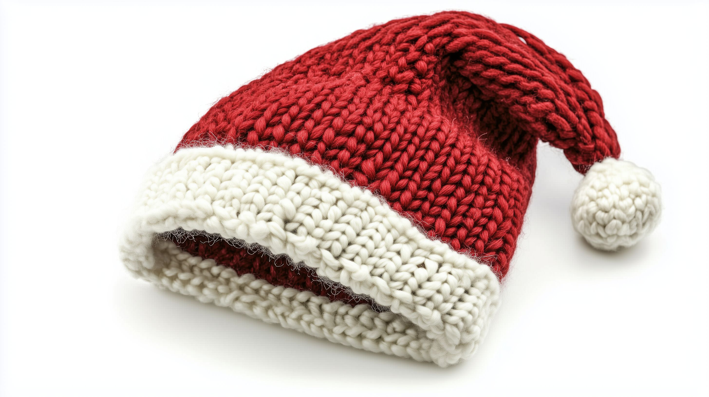 Das Bild zeigt eine traditionelle, gehäkelte Weihnachtsmütze in den Farben Rot und Weiß. Die Mütze ist detailliert gearbeitet und hat einen typischen Weihnachtsmannstil mit den beiden weißen Pompons an den Enden. Sie ist vor einem weißen Hintergrund isoliert fotografiert, wodurch ihre Struktur und Farbgebung besonders gut zur Geltung kommen. Diese festliche Mütze eignet sich perfekt als kostenfreies Stockfoto für Weihnachtsdekorationen, Blog-Beiträge, Social-Media-Posts oder Werbematerialien rund um die Feiertage. Das hochauflösende Bild steht unter der Creative-Commons-Lizenz zur Verfügung.