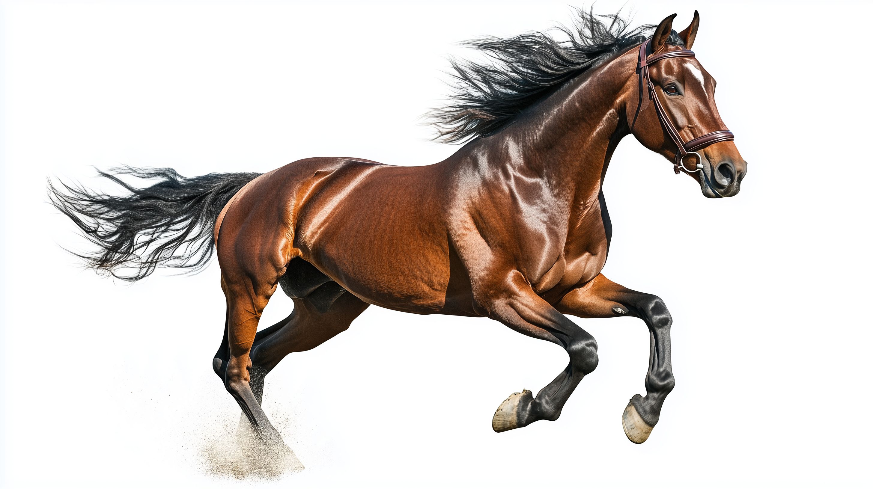 Dieses detailreiche Stockfoto zeigt einen kräftigen, braunen Hengst in vollem Galopp vor einem weißen Hintergrund. Das Pferd rennt mit erhobenen Beinen und flatternder Mähne, was eine starke Dynamik und Energie vermittelt. Die scharfe Fokussierung, die satte Farbgebung und der Freisteller-Effekt lassen das Motiv klar und eindrucksvoll hervortreten. Dieses Bild eignet sich hervorragend für den Einsatz in Blogs, Newsletter-Layouts, Social-Media-Posts oder Werbekampagnen rund um Themen wie Pferdesport, Tierwelt, Landwirtschaft und Landschaft. Das hochauflösende Foto ist unter einer kostenlosen Creative-Commons-Lizenz verfügbar.