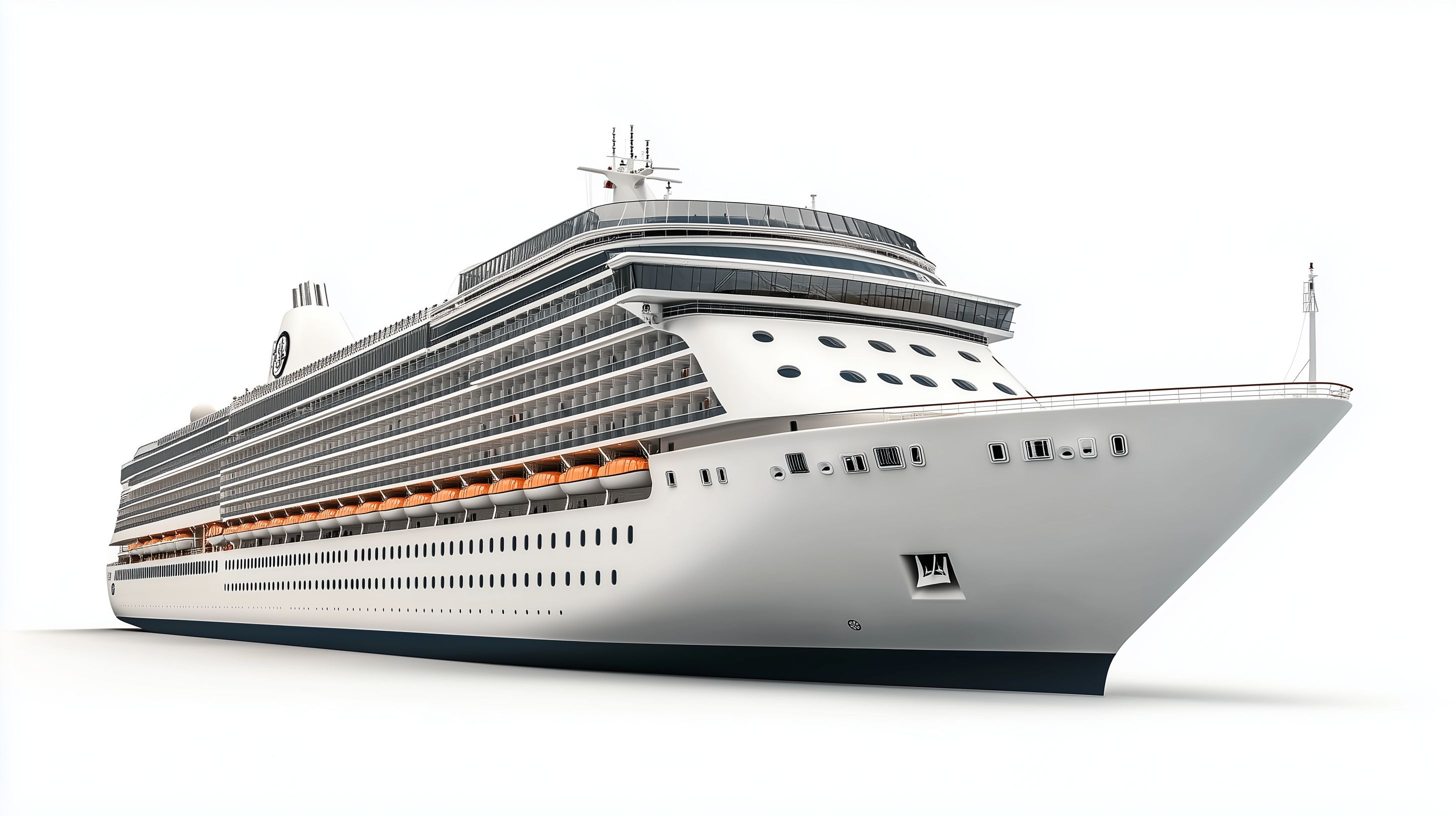 Das Bild zeigt ein großes, modernes Kreuzfahrtschiff vor einem weißen Hintergrund. Das Schiff hat eine elegante, futuristische Silhouette mit einer imposanten Größe und markanten, geraden Linien. Es ist in einer neutralen Farbpalette gehalten, mit dominierendem Weiß, Grau und Schwarz. Die Deck- und Aufbauten wirken sauber und modern gestaltet, mit zahlreichen Fensterreihen und Balkonen, die auf eine luxuriöse Ausstattung und Raumaufteilung für die Passagiere hinweisen. Das Foto könnte für verschiedenste Anwendungen wie Reise- und Tourismus-Themen, Werbe- oder Marketingmaterialien, Reiseportale oder Kreuzfahrt-Anbieter-Websites eingesetzt werden. Als hochwertiges Stockfoto in hoher Auflösung und unter einer Creative-Commons-Lizenz ist es sowohl für private als auch für kommerzielle Zwecke frei verwendbar.