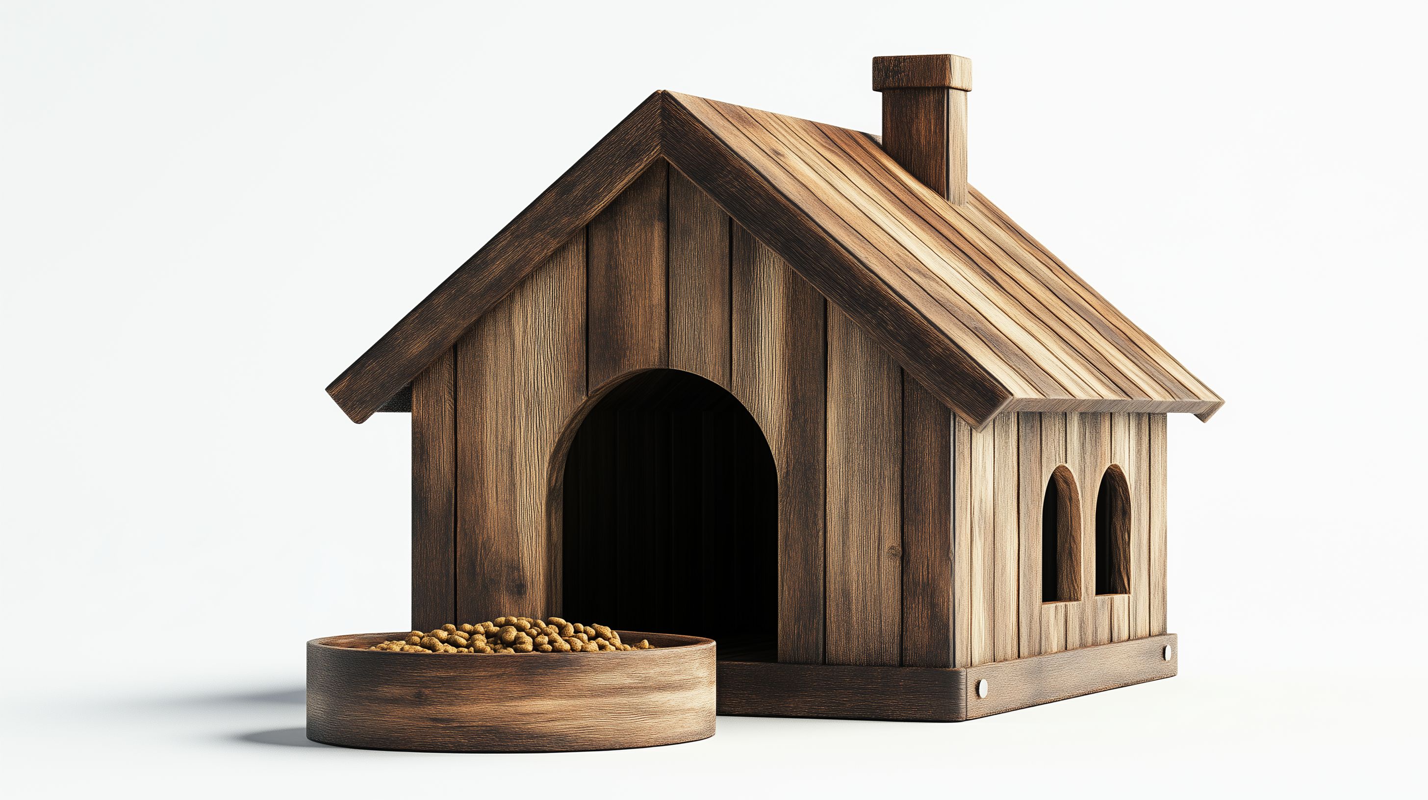 Das Bild zeigt eine detaillierte 3D-Darstellung einer rustikalen Hundehütte aus Holz mit einem Futter-Napf davor, vor weißem Hintergrund. Die Hütte ist im Landhausstil gehalten, mit einem spitzen Dach und einer gewölbten Eingangstür. Der Napf enthält Trockenfutter für Hunde. Das Bild eignet sich hervorragend für die Verwendung in Blogs, Newslettern oder Social-Media-Beiträgen zum Thema Haustiere, Heimtierbedarf oder Tierfütterung. Als kostenloses Stockfoto in hoher Auflösung und mit Creative-Commons-Lizenz ist es vielseitig einsetzbar.