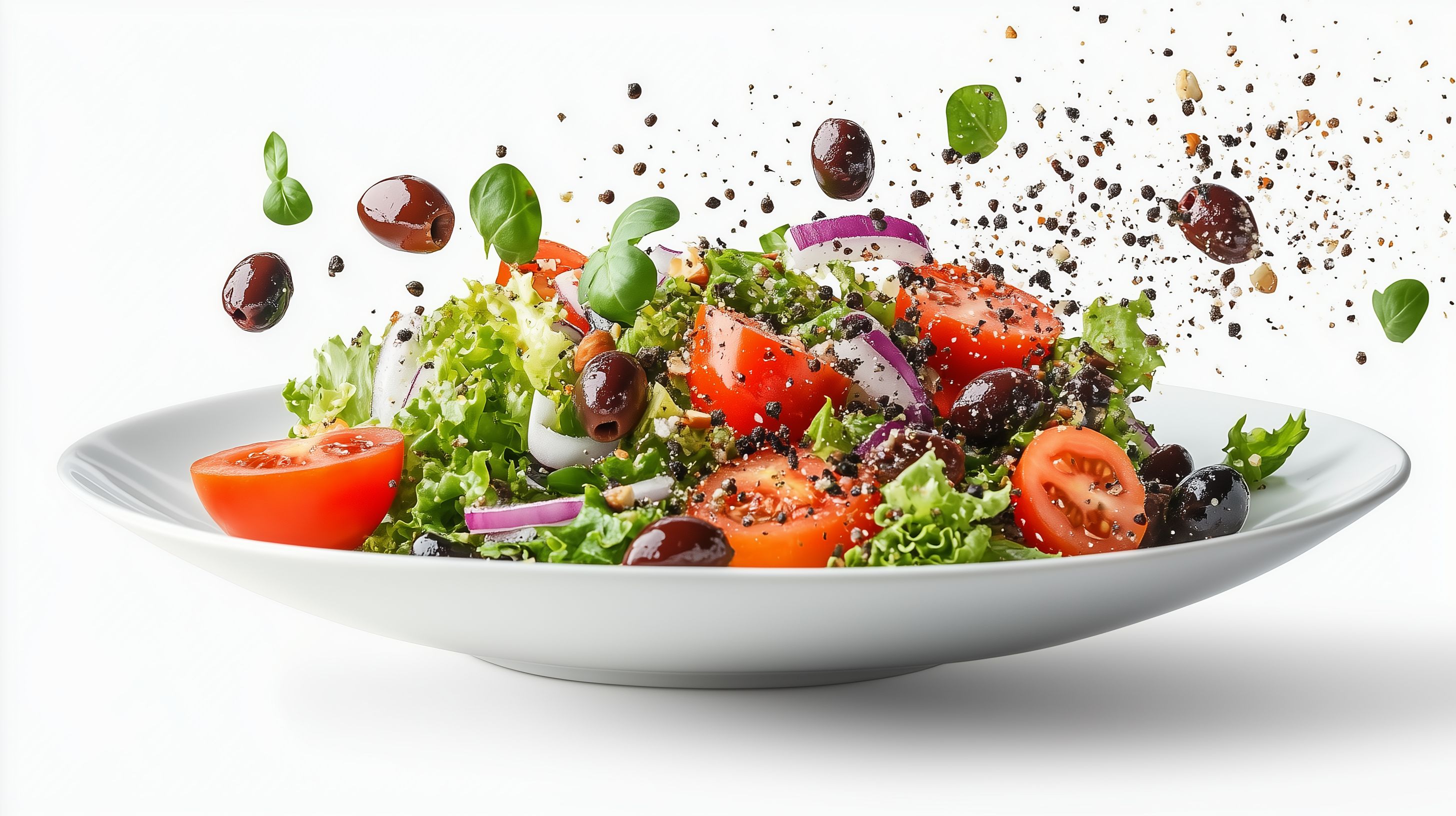 Dieses Bild zeigt einen frischen, bunten Gemüse-Salat, der in einer rustikalen weißen Schüssel angerichtet ist. Die Zutaten wie Tomaten, Oliven, Basilikumblätter und weitere Salate wie Romana scheinen gerade in die Schüssel zu fliegen, was eine lebendige und dynamische Komposition ergibt. Der weiße Hintergrund lässt die Farben und Formen des Salats optimal zur Geltung kommen. Dieses hochauflösende Foto eignet sich hervorragend als kostenloses Stockfoto für Beiträge zu gesunder Ernährung, Fitness, Wellness und Vegetarismus in Blogs, Newslettern oder Werbematerialien unter der Creative Commons-Lizenz.