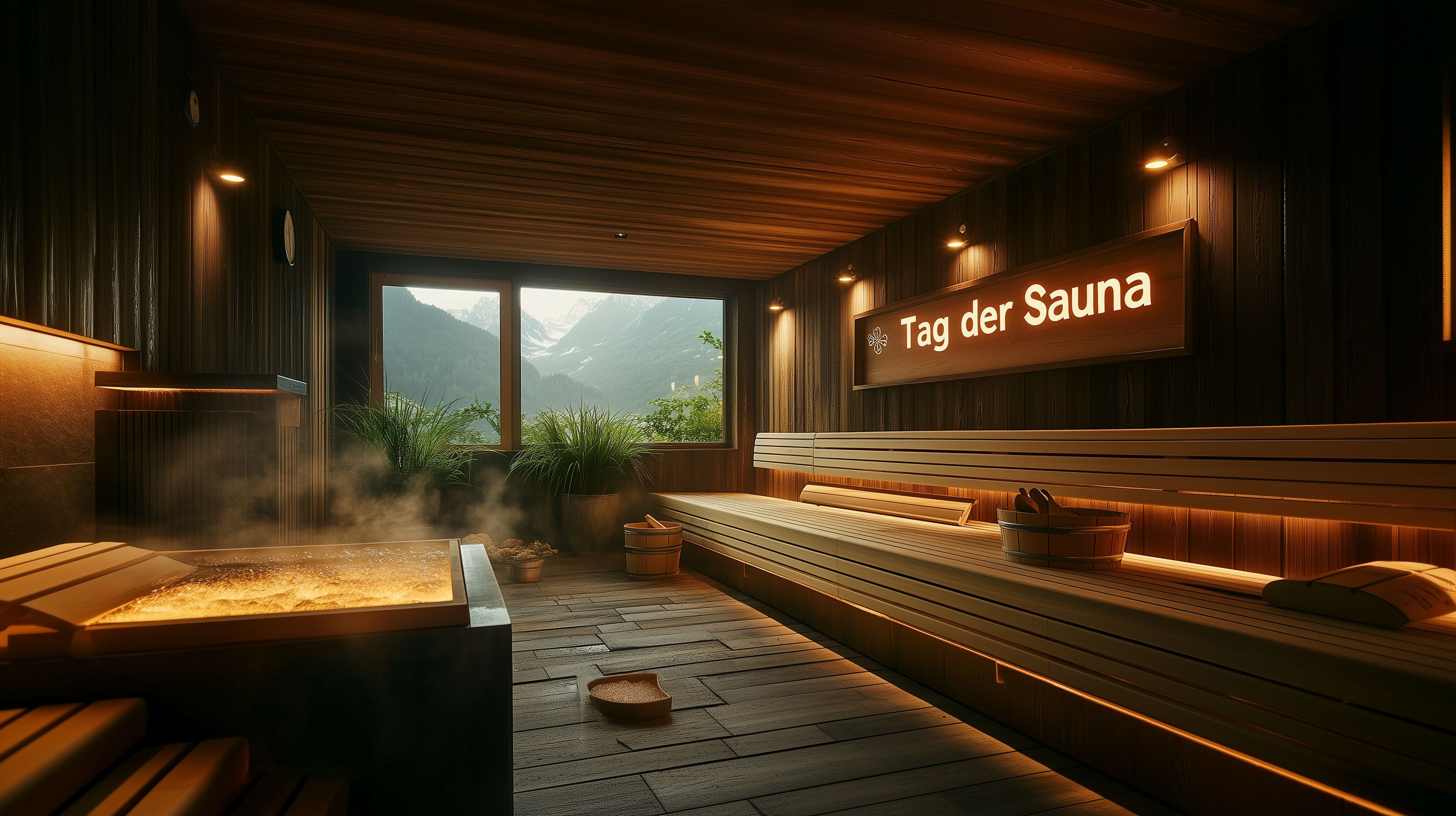 Das Foto zeigt eine gemütliche und einladende Saunalandschaft mit Blick auf eine Bergkulisse. Der Raum ist mit edler Holzvertäfelung ausgestattet und verfügt über eine moderne Beleuchtung, die eine angenehme Atmosphäre schafft. Grünpflanzen und andere natürliche Elemente verleihen dem Spa-Bereich einen wohnlichen und exklusiven Charakter. Das Bild eignet sich hervorragend für den Einsatz in Magazinen, Blogs oder Werbekampagnen rund um die Themen Wellness, Gesundheit und hochwertiges Wohnen. Als kostenloses Stockfoto in hoher Auflösung und unter Creative-Commons-Lizenz bietet es vielfältige Einsatzmöglichkeiten.