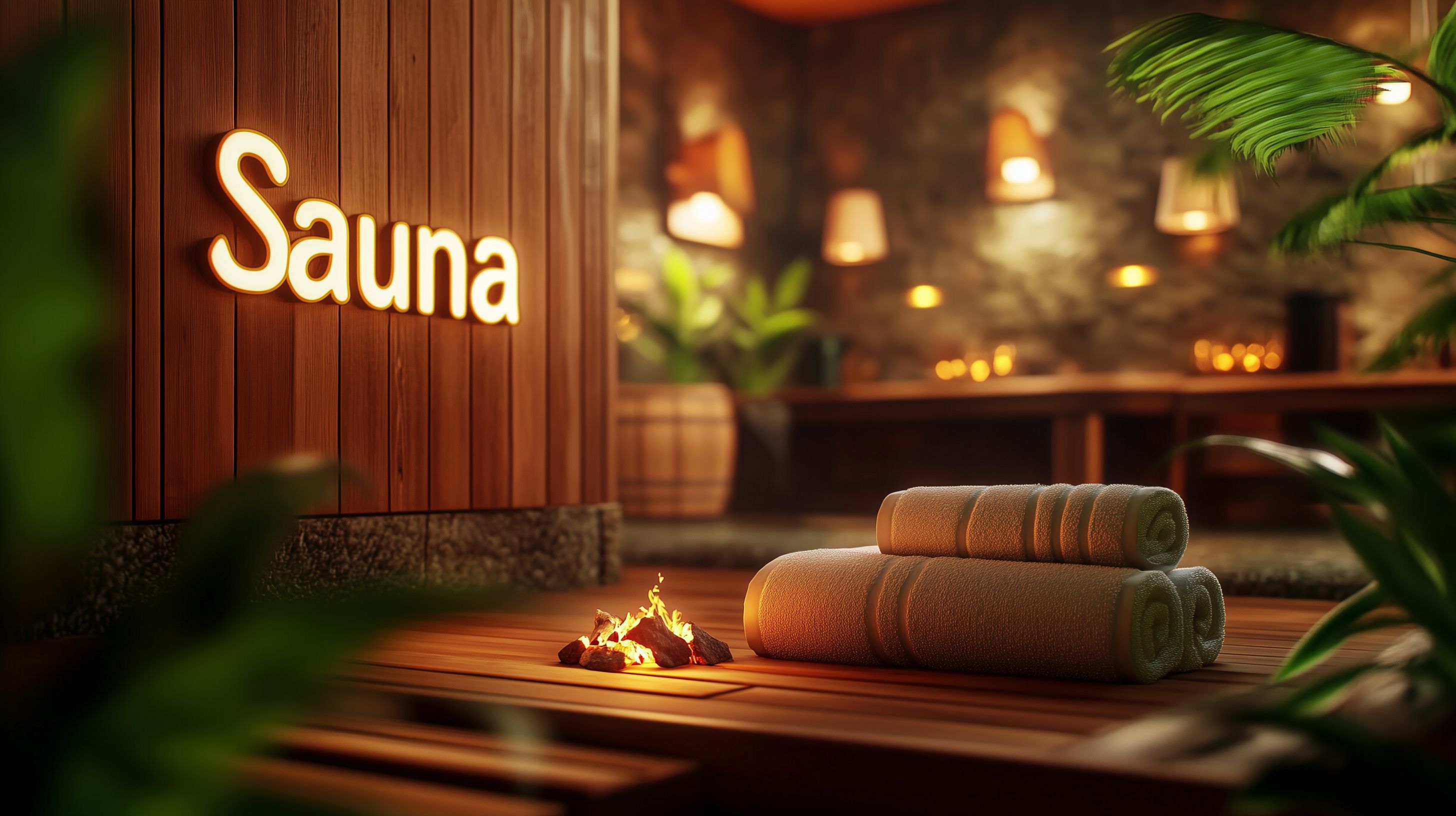 Dieses einladende Saunabild zeigt eine gemütliche, rustikale Saunakabine mit einem Feuer im Inneren. Der Raum ist mit Holzvertäfelung und Grünpflanzen gestaltet, die eine entspannende und natürliche Atmosphäre schaffen. Auf dem Boden liegen weiche, braune Handtücher bereit, die zum Relaxen und Wohlfühlen einladen. Das warme, natürliche Licht sowie die Beleuchtung erzeugen eine einladende Stimmung, die zum Verweilen und Abschalten einlädt. Dieses hochwertige Stockfoto in hoher Auflösung eignet sich perfekt für Wellness-Blogbeiträge, Werbekampagnen oder Reise-Newsletter rund um das Thema Entspannung und Erholung. Das Bild ist unter einer Creative Commons-Lizenz frei nutzbar.