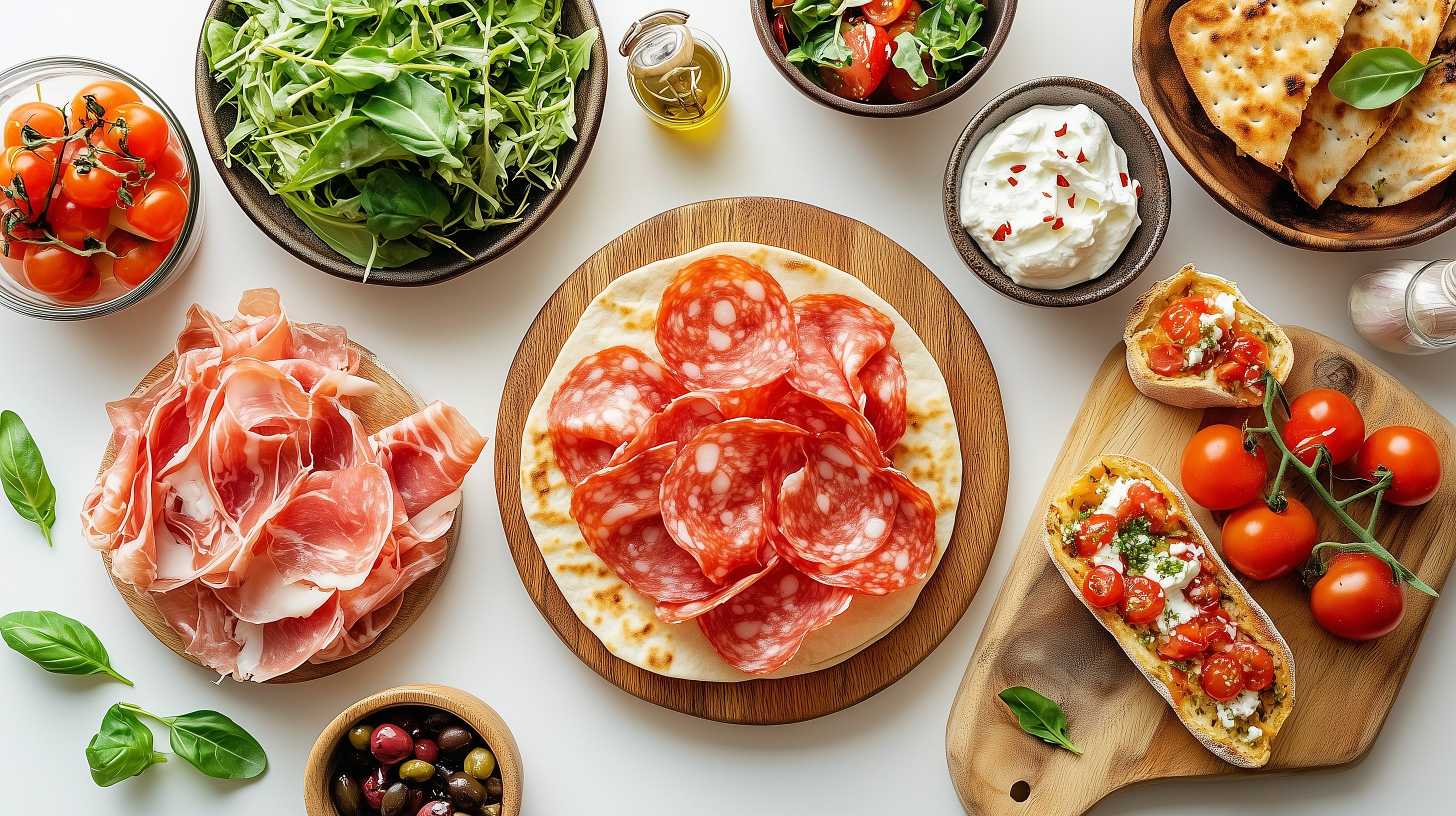 Dieses Foto zeigt eine Anordnung von frischen italienischen Lebensmitteln und Zutaten auf einem weißen Untergrund. Im Mittelpunkt befindet sich eine Holzplatte mit Scheiben einer würzigen Salami. Daneben liegen Scheiben eines weichen, mediterran anmutenden Brots wie eine Piadina. Rund herum sind weitere typische Zutaten italienischer Küche zu sehen: frische Tomaten, Basilikumblätter, Oliven und eine kleine Portion Frischkäse. Das Ganze ergibt eine einladende, appetitliche Komposition in warmen, natürlichen Farbtönen. Dieses Foto eignet sich ideal als Hintergrundbild für Websites, Blogs oder Social-Media-Posts zum Thema italienische Küche, Lebensmittel oder Rezepte. Das hochauflösende, frei verwendbare Stockfoto bietet eine gute visuelle Darstellung der Zutaten einer klassischen mediterranen Mahlzeit.