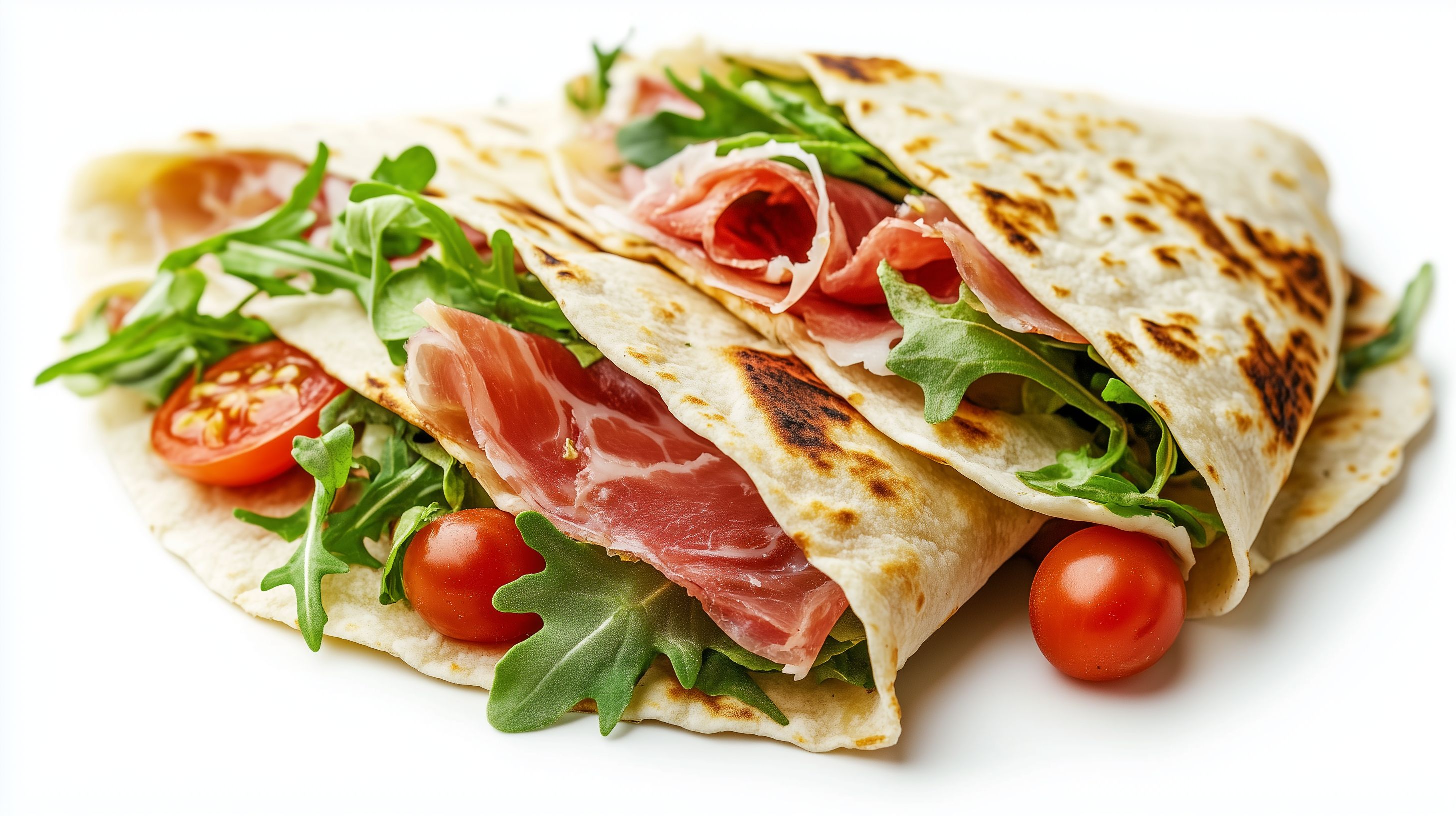Dieses Foto zeigt eine köstliche italienische Piadina, eine Art flaches Fladenbrot, gefüllt mit Prosciutto, frischen Tomaten und knackigem Salat. Die Zutaten sind ansprechend in der Piadina angerichtet und heben sich vor dem hellen Hintergrund gut ab. Das Bild besticht durch seine rustikale Optik und den appetitlichen Gesamteindruck. Diese Aufnahme eignet sich hervorragend für Foodblogbeiträge, Rezeptsammlungen oder Werbematerialien rund um italienische Küche und leckere Mittagssnacks. Als hochauflösendes, kostenloses Stockfoto unter Creative-Commons-Lizenz kann es vielfältig eingesetzt werden.