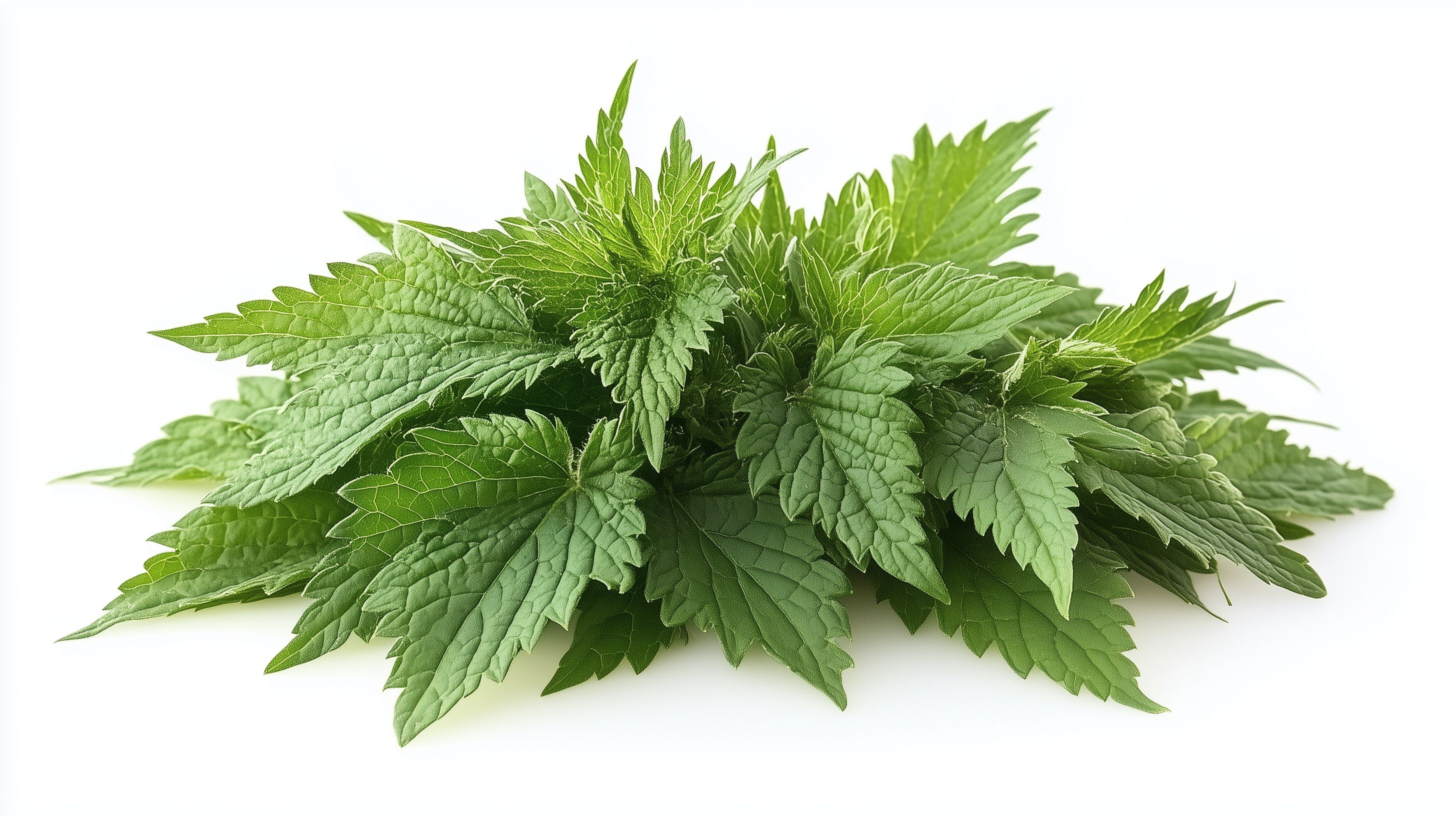 Dieses Bild zeigt eine Ansammlung frischer, grüner Brennnesselblätter auf einem weißen Hintergrund. Die Brennnesselblätter haben eine dunkelgrüne, glänzende Farbe und eine typische, leicht gezackte Blattform. Das Bild vermittelt den Eindruck von Frische, Natürlichkeit und Gesundheit. Die Brennnessel ist eine bekannte Heilpflanze, die vielfältig in der Naturkosmetik, Medizin und Nahrungsergänzung eingesetzt wird. Dieses kostenlose Stockfoto in hoher Auflösung unter Creative-Commons-Lizenz eignet sich hervorragend für Blog-Beiträge, Newsletter-Layouts oder Social-Media-Posts rund um Gesundheit, Naturheilkunde und vegane Ernährung.