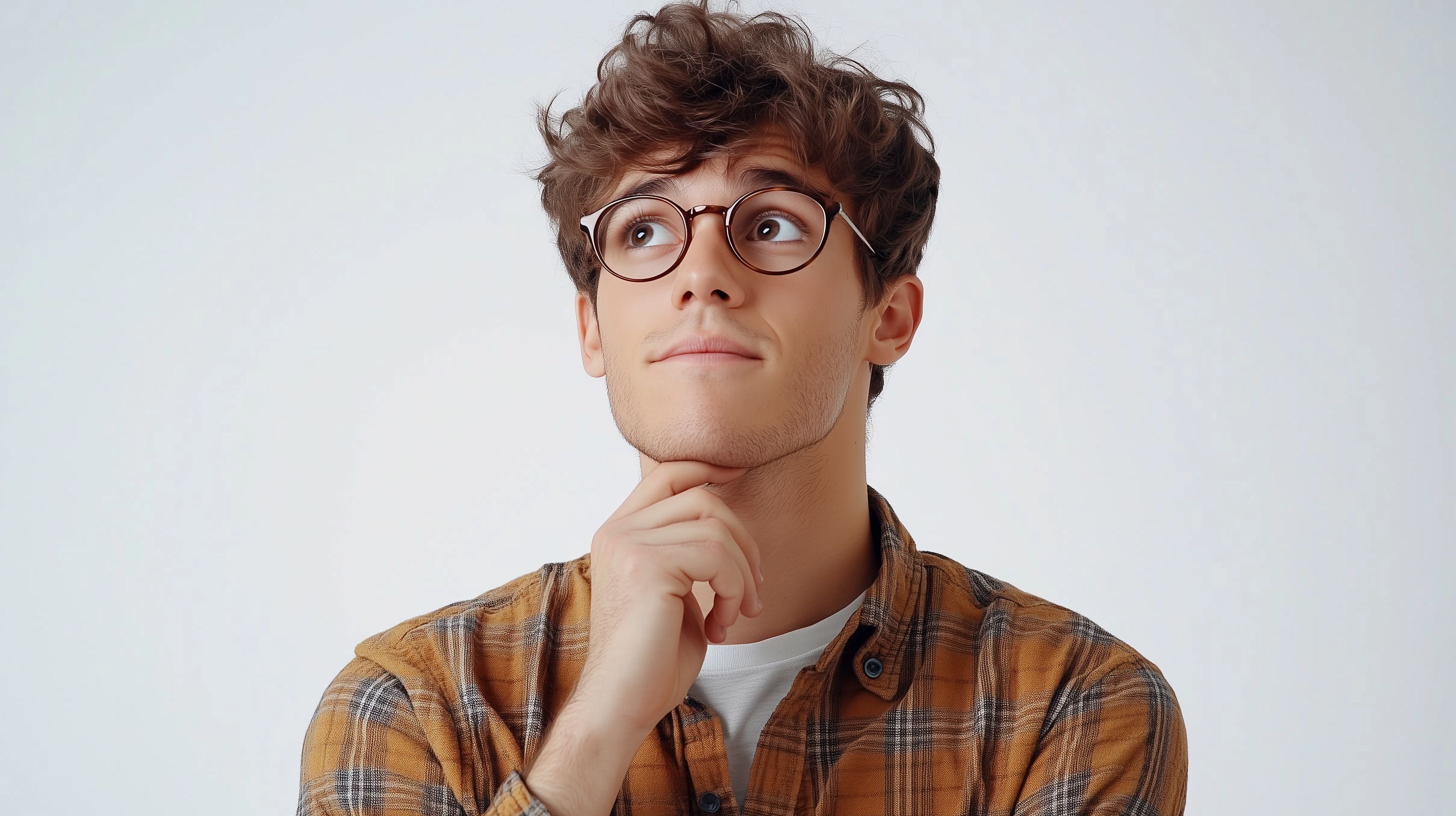 Dieses Stockfoto zeigt einen nachdenklichen jungen Mann mit einer Brille und lockiger Frisur. Er schaut konzentriert in die Kamera, die Hand an seinem Kinn, als würde er über etwas nachdenken. Der Mann trägt ein kariertes Hemd vor einem weißen Hintergrund, was ihn in den Fokus rückt und die Aufmerksamkeit auf seinen Gesichtsausdruck lenkt.