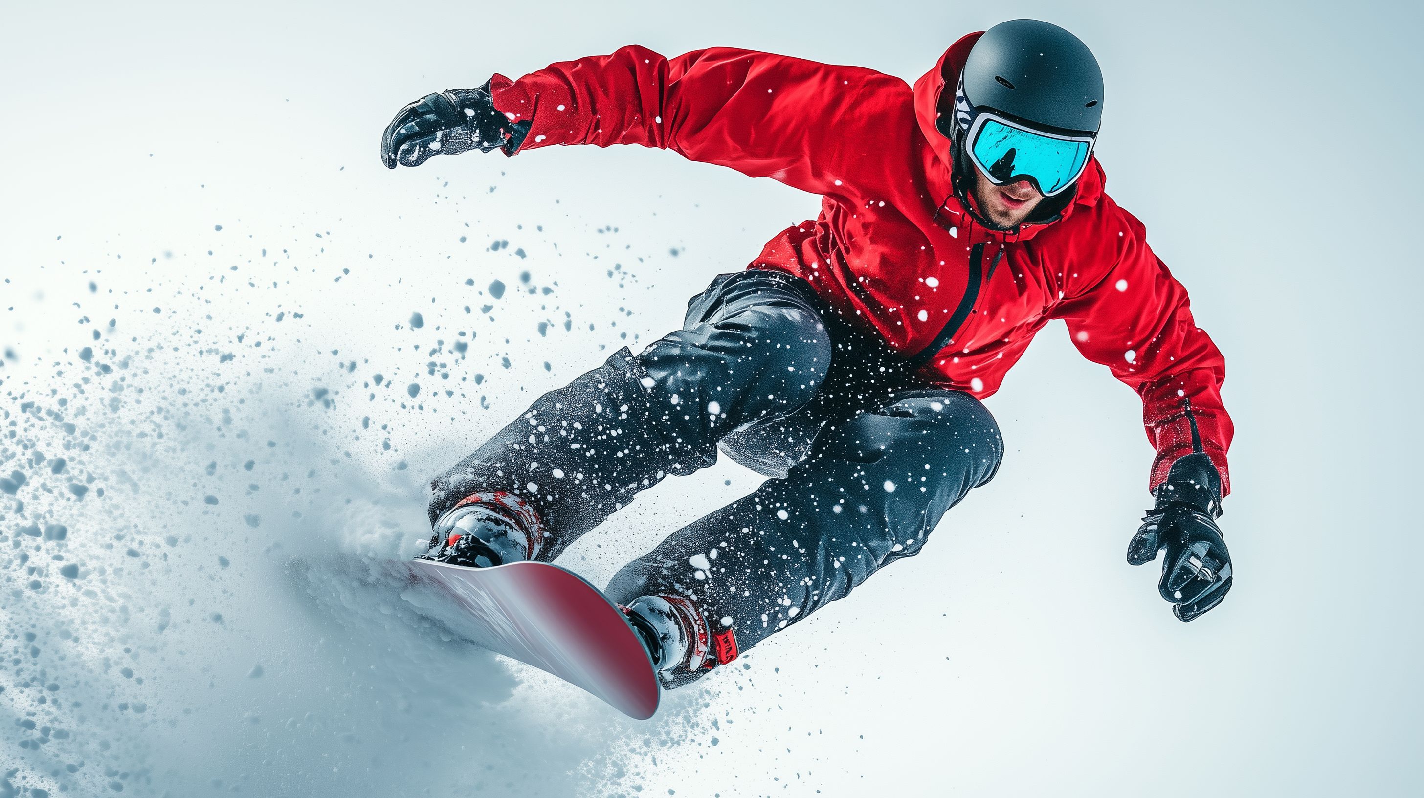 Das Bild zeigt einen dynamischen Snowboarder, der in der Luft fliegt und dabei Schneeflocken aufwirbelt. Er trägt eine rote Jacke und eine Skibrille und führt eine waghalsige Bewegung aus, vermutlich einen Sprung oder eine Drehung auf der Piste. Die Szene vermittelt den Thrill und die Geschwindigkeit des Wintersports. Das Bild eignet sich hervorragend für den Einsatz in Blogbeiträgen, Newslettern, Werbematerialien oder Social-Media-Kanälen rund um Wintersport, Outdoor-Aktivitäten und abenteuerliche Sportarten. Die hochauflösende Datei ist unter einer Creative-Commons-Lizenz frei verfügbar.