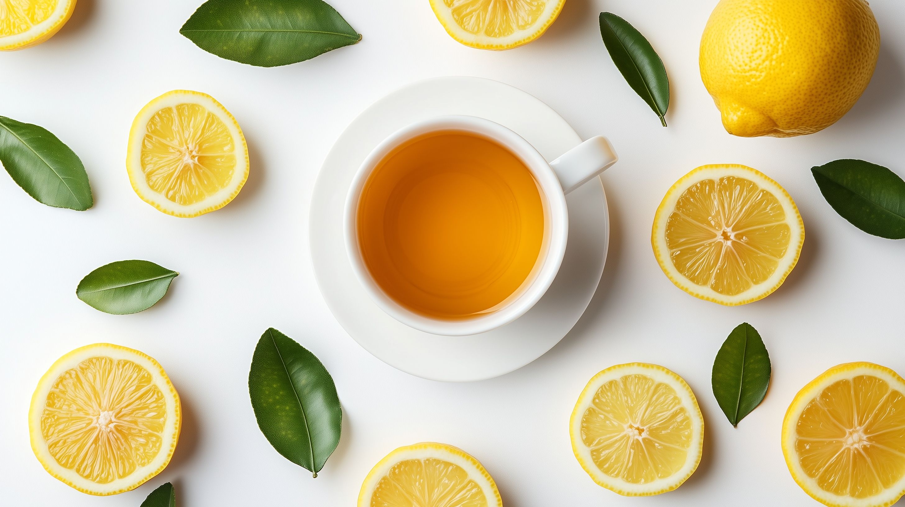 Dieses Foto zeigt einen Becher voller dampfender, goldener Zitronentee-Flüssigkeit, umgeben von frischen Zitronenscheiben und grünen Blättern auf einem weißen Hintergrund. Die Anordnung der Elemente in einer flachen Perspektive verleiht dem Bild eine natürliche, einladende Atmosphäre. Es eignet sich perfekt als kostenloses Stockfoto für verschiedene Einsatzbereiche wie Blogbeiträge, Social-Media-Posts, Newsletter oder Werbematerial mit Fokus auf gesunde, erfrischende Getränke, Zitrusfrüchte oder eine sommerliche Stimmung. Das hochauflösende Foto unter Creative-Commons-Lizenz bietet viel Raum für Kreativität und visuelle Gestaltung.