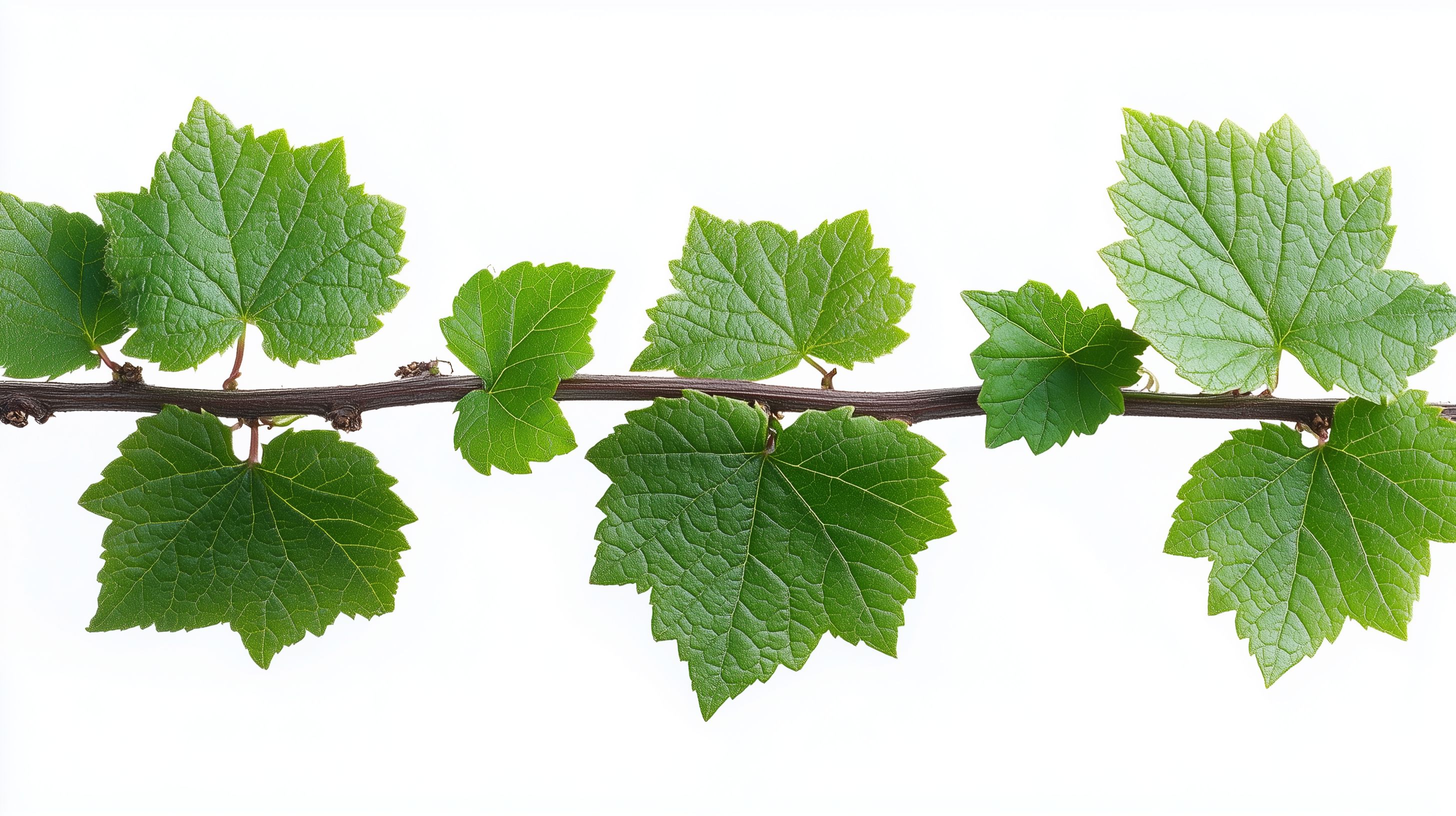 Dieses Foto zeigt eine Reihe frischer, grüner Weinblätter, die auf einem Ast wachsen. Die Blätter sind in verschiedenen Größen und Formen zu sehen und heben sich durch ihr kräftiges Grün vom weißen Hintergrund ab. Dieses stimmungsvolle Bild eignet sich hervorragend als Hintergrundfoto für Food-Fotografie, Rezeptblogbeiträge oder Werbung für biologische und natürliche Lebensmittel. Das hochauflösende Stockfoto steht unter einer Creative-Commons-Lizenz zur freien Nutzung zur Verfügung.