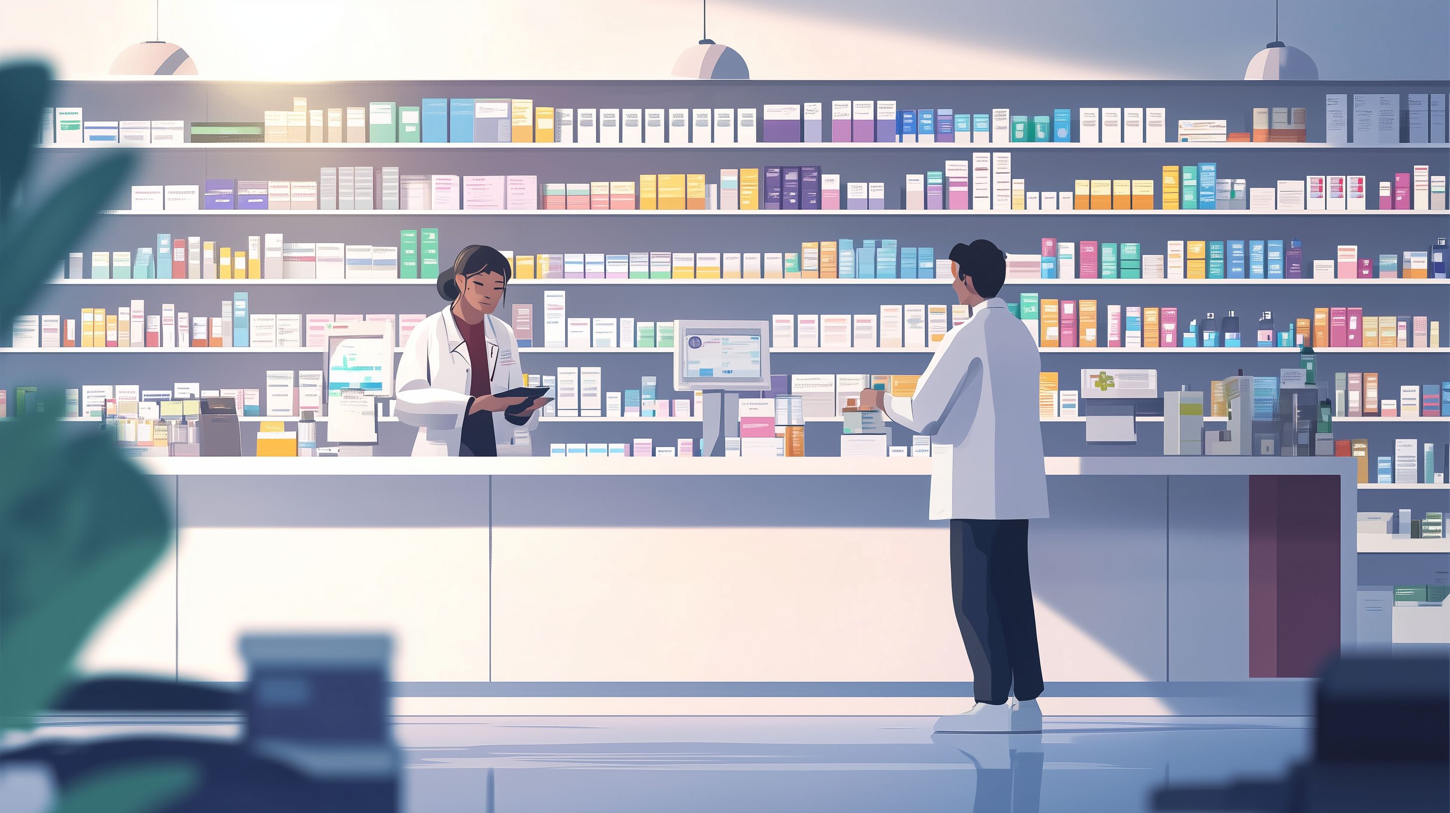 Das Foto zeigt das Interieur einer modernen Apotheke mit einem umfangreichen Produktsortiment. Im Vordergrund sieht man einen Verkaufstresen, an dem zwei Angestellte in weißen Kitteln mit einem Kunden interagieren. Im Hintergrund erstrecken sich die Regale von Boden bis Decke, gefüllt mit einer Vielzahl verschiedener Medikamente, Vitaminen, Kosmetikprodukten und anderen Gesundheitsartikeln. Die Farbpalette ist sanft und elegant, mit hellblauen und gelben Akzenten, die dem Raum eine freundliche Atmosphäre verleihen. Dieses Stockfoto eignet sich hervorragend für den Einsatz in Blogbeiträgen, Newslettern, Social-Media-Kanälen oder Werbekampagnen rund um das Thema Gesundheit, Pharmazie, Einzelhandel oder Lifestyle. Das Bild ist in hoher Auflösung und unter einer Creative-Commons-Lizenz verfügbar.