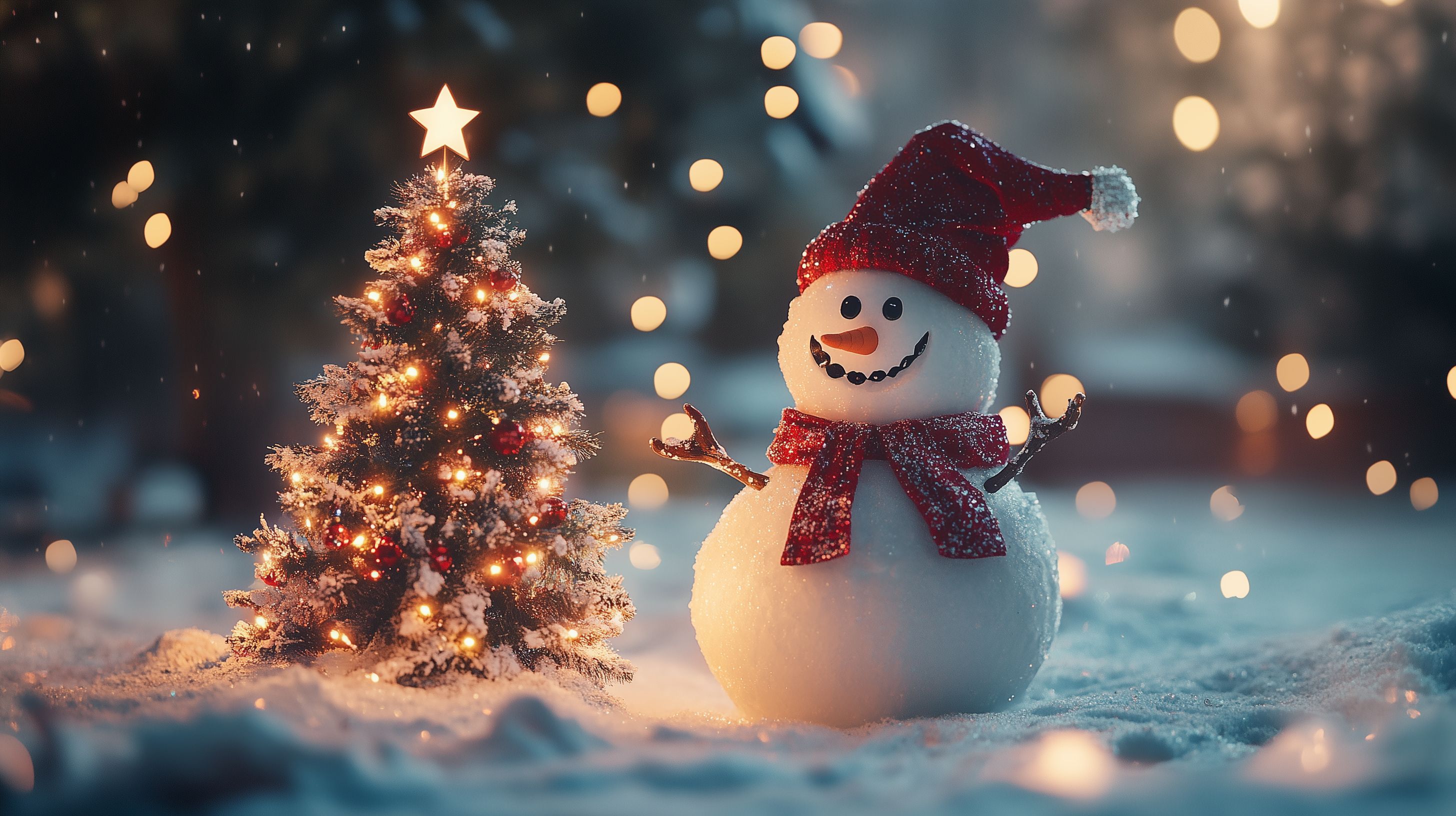 Dieses stimmungsvolle Weihnachtsfoto zeigt einen fröhlichen Schneemann, der neben einem geschmückten Weihnachtsbaum in einer verschneiten Winterlandschaft steht. Der Schneemann trägt einen roten Hut und Schal und verleiht der Szene eine festliche, gemütliche Atmosphäre. Das Bild ist in warmen, goldenen Tönen gehalten und wird durch die Lichterketten am Baum zusätzlich beleuchtet, was eine wunderbare, fast magische Stimmung erzeugt. Dieses kostenlose Stockfoto in hoher Auflösung eignet sich hervorragend für Weihnachtsdekorationen, Grußkarten, Websites oder Social-Media-Posts rund um die Feiertage. Es steht unter der Creative-Commons-Lizenz zur freien Nutzung zur Verfügung.