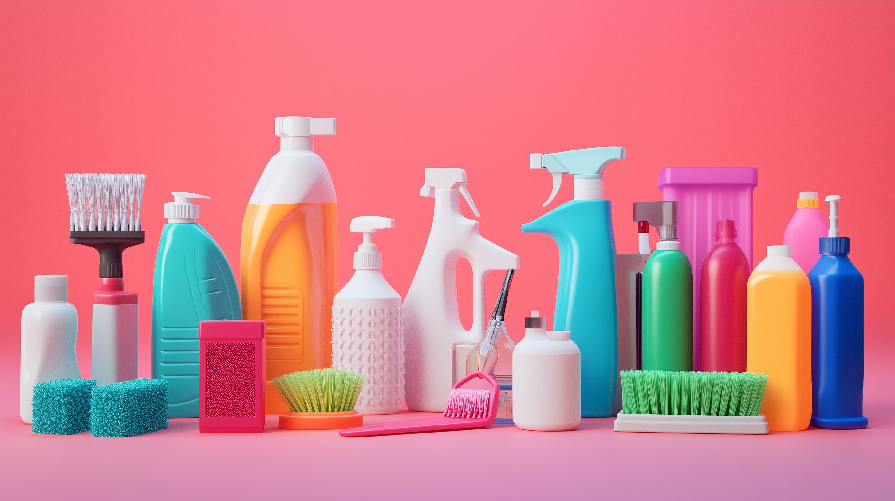 Dieses Bild zeigt eine bunte Auswahl an verschiedenen Reinigungsmitteln und Putzhilfen vor einem einfarbig rosa-roten Hintergrund. Die Objekte sind sorgfältig und ansprechend arrangiert, um eine aufgeräumte und organisierte Optik zu vermitteln. Dazu gehören Sprühflaschen, Bürsten, Schwämme, Handschuhe und weitere Utensilien in Pastelltönen wie Grün, Blau, Orange und Lila. Diese Aufnahme eignet sich hervorragend als hochwertiges, kostenloses Stockfoto für Blogs, Newsletter, Social-Media-Kanäle oder Werbeanzeigen rund um das Thema Reinigung, Haushalt und Hygiene. Das Bild ist in hoher Auflösung verfügbar und unter einer Creative-Commons-Lizenz lizenziert.