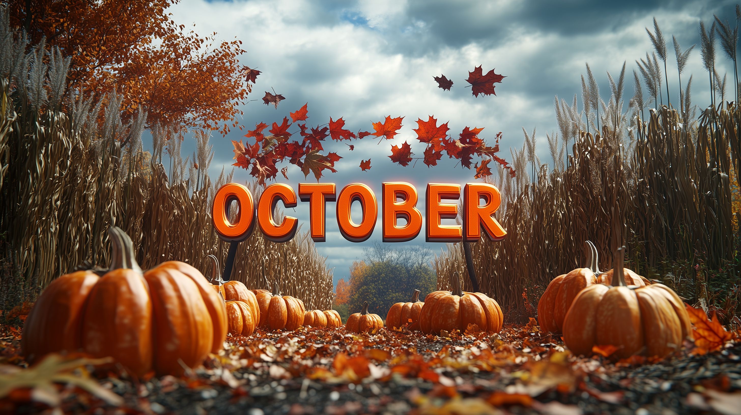 Dieses malerische Foto zeigt eine typisch herbstliche Landschaft mit großen, orangen Kürbissen, die auf dem Boden verteilt sind. Rund um die Kürbisse liegen bunte, rote Ahornblätter, die im Wind flattern. Im Hintergrund ist ein Maisfeld zu sehen, darüber ein bewölkter Himmel. Die Szenerie vermittelt eine gemütliche, ländliche Herbststimmung und ist ideal als Hintergrundbild für Herbst-Themen, wie Erntedank, Halloween oder Thanksgiving, geeignet. Dieses hochauflösende, kostenlose Stockfoto unter Creative-Commons-Lizenz kann in verschiedensten Anwendungen, wie Blogbeiträge, Newsletter oder Social-Media-Posts, verwendet werden.