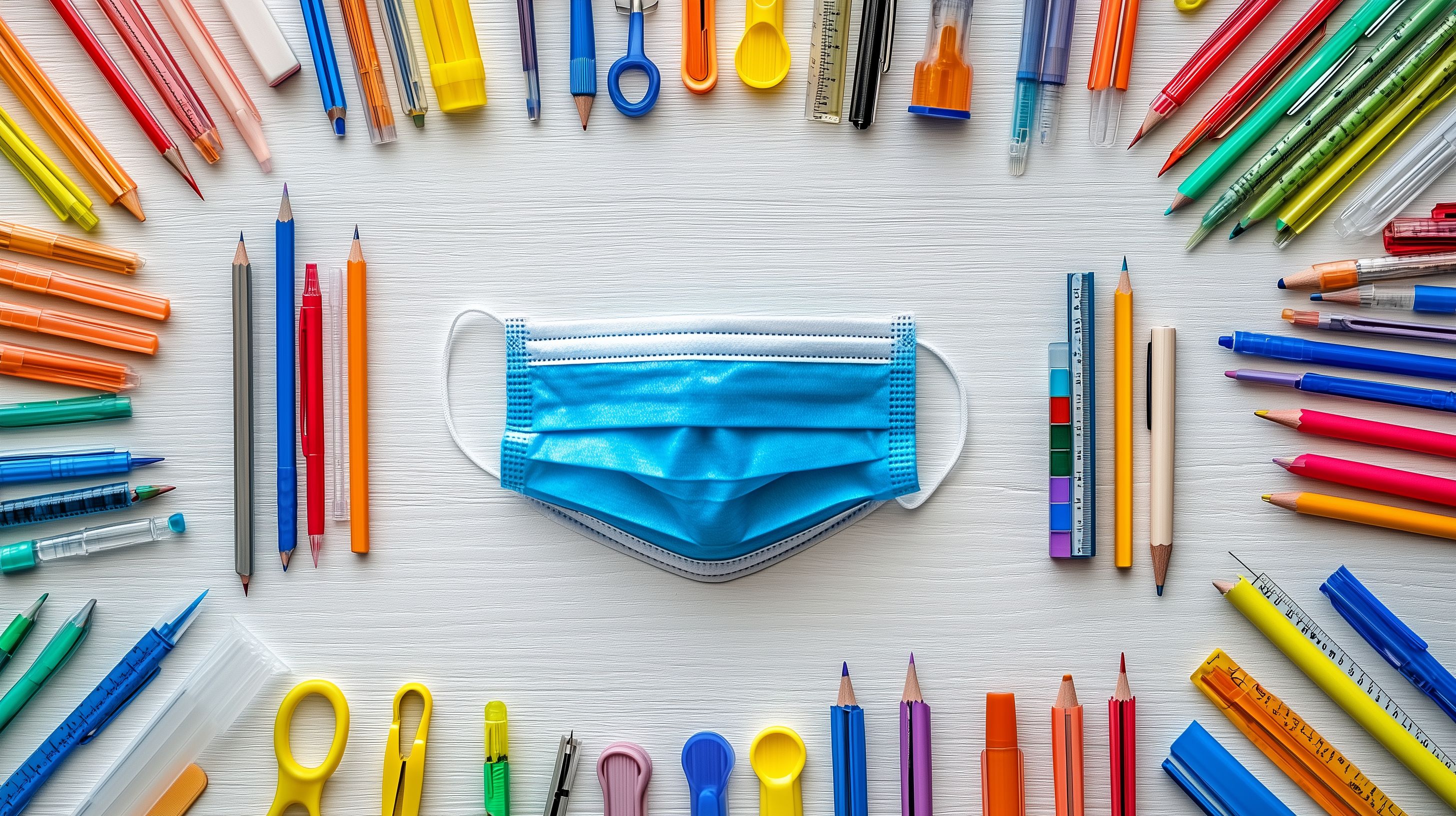 Dieses Stockfoto zeigt eine bunte Ansammlung von Schulutensilien wie Stifte, Marker, Lineale und andere kreative Materialien, die um eine medizinische Gesichtsmaske herum angeordnet sind. Die farbenfrohe Komposition vermittelt einen spielerischen und kreativen Eindruck, der das Thema Bildung mit dem aktuellen Gesundheitsthema der COVID-19-Pandemie verbindet. Dieses hochauflösende Foto eignet sich hervorragend für die Verwendung in Blogbeiträgen, Newslettern, Social-Media-Kanälen oder Werbematerialien, die sich mit Themen wie Schule, Lernen, Kreativität oder den Herausforderungen der Pandemie auseinandersetzen. Das Bild steht unter einer Creative-Commons-Lizenz kostenlos zur Verfügung.
