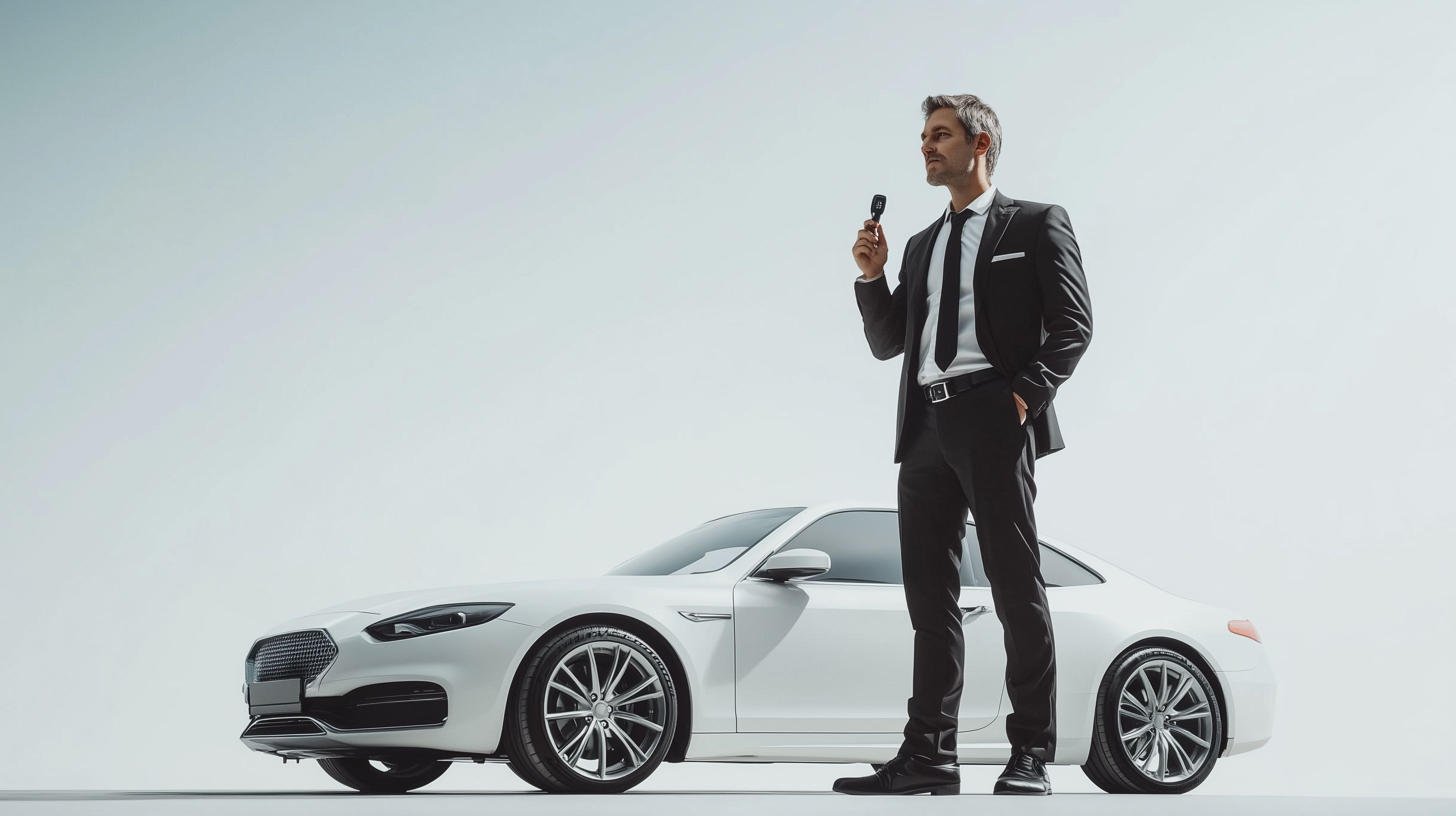 Das Bild zeigt einen eleganten Geschäftsmann, der einen Autoschlüssel in der Hand hält und vor einem weißen Luxusfahrzeug steht. Der Mann trägt einen schwarzen Anzug mit Krawatte, was einen professionellen und geschäftlichen Kontext vermittelt. Das Auto ist prominent im Bild platziert, was die Bedeutung des Fahrzeugs als Produkt oder Verkaufsobjekt unterstreicht. Die Komposition ist minimalistisch und fokussiert den Betrachter auf das Wesentliche - den Geschäftsmann und das Luxusauto. Dieses Stockfoto eignet sich hervorragend für den Einsatz in Werbekampagnen, Blogbeiträgen oder Newslettern rund um Themen wie Automobilbranche, Mobilität, Finanzen oder Luxusprodukte. Es ist in hoher Auflösung und unter einer Creative-Commons-Lizenz verfügbar.