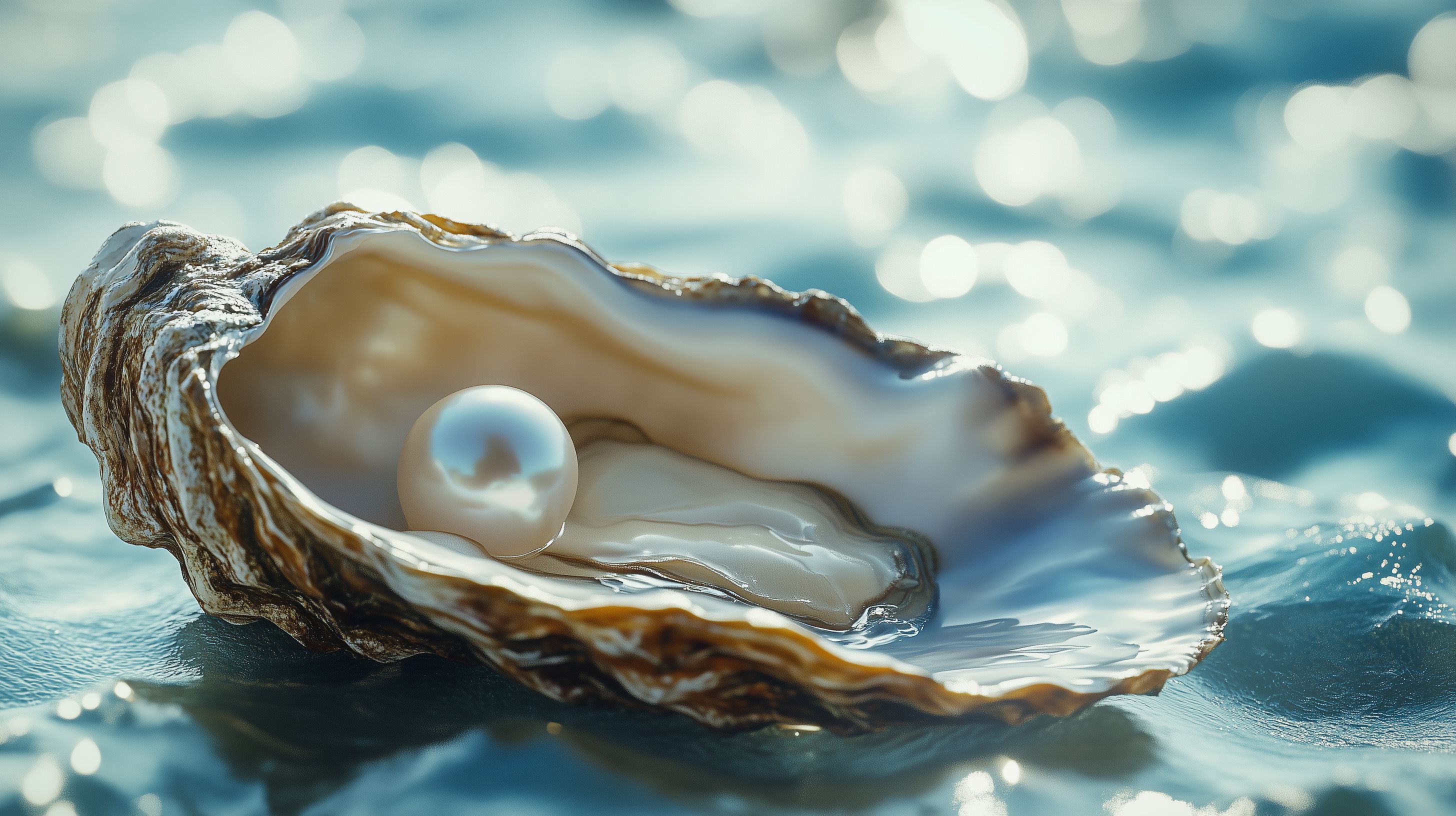Dieses stimmungsvolle Foto zeigt eine glänzende Perle, eingebettet in einer irisierenden Perlmutt-Muschel, die auf der Oberfläche des Meeres schwimmt. Die warmen Brauntöne und der glänzende Glanz der Muschel kontrastieren mit dem kühlen Blauton des Wassers und dem sanften Spiel des Lichts, das sich auf der Oberfläche widerspiegelt. Dieses Bild strahlt Ruhe, Natürlichkeit und Eleganz aus und ist ideal als Hintergrundbild für Webseiten, Social-Media-Posts oder Werbematerial in den Bereichen Schmuck, Wellness, Spa oder Lifestyle einsetzbar. Das hochauflösende Foto ist als kostenloses Stockfoto unter einer Creative-Commons-Lizenz verfügbar.