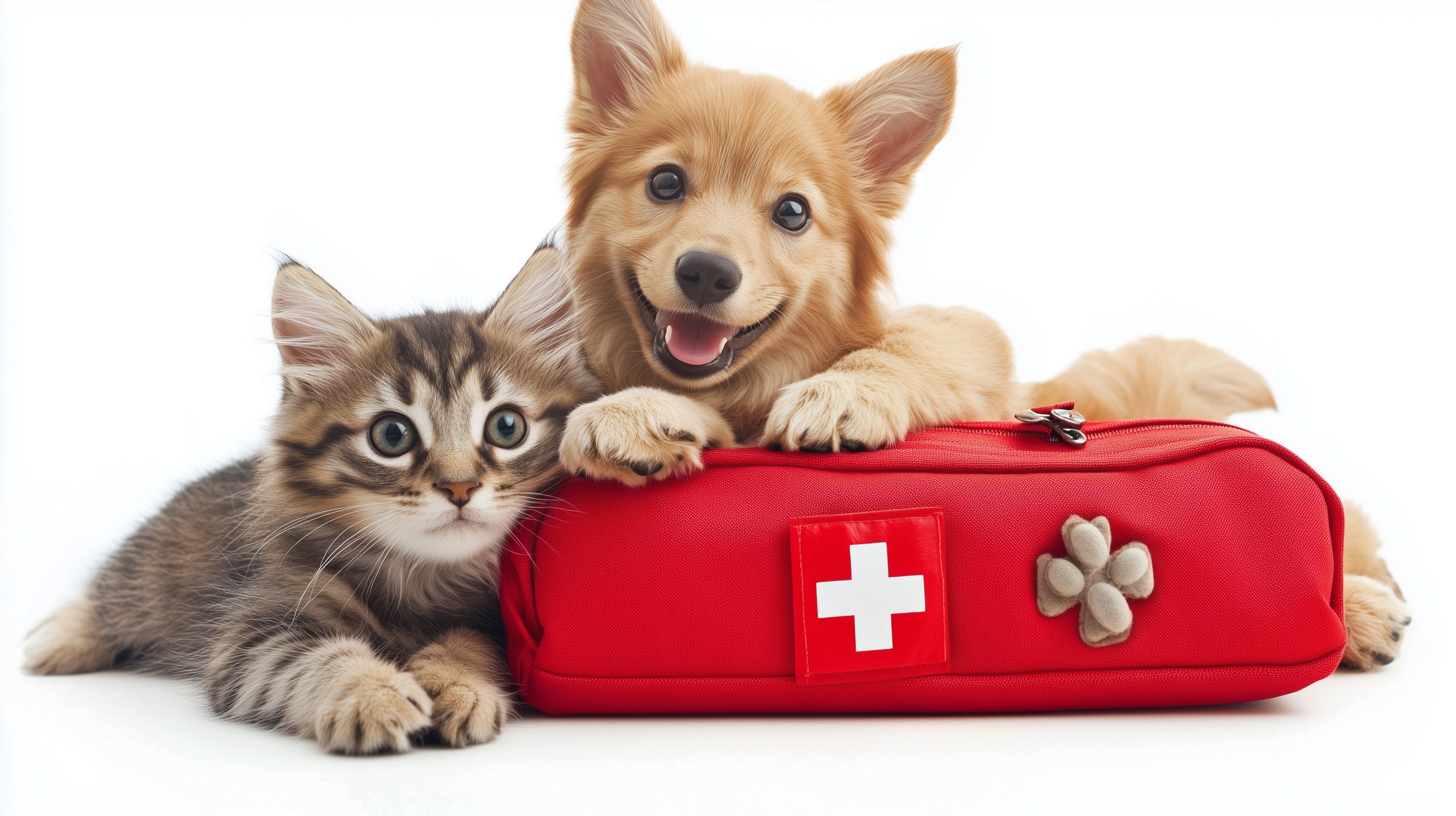 Das Foto zeigt einen fröhlichen Welpen und ein Kätzchen, die zusammen in einem roten Erste-Hilfe-Kasten für Haustiere sitzen. Der Kasten ist mit einem weißen Kreuz-Symbol und einer Pfötchenprägung gekennzeichnet. Die Tiere blicken freundlich und vergnügt in die Kamera. Dieses bunte, liebevolle Bild eignet sich hervorragend als kostenloses Stockfoto für Beiträge rund um Tierhaltung, Veterinärmedizin oder Erste Hilfe für Haustiere. Die hohe Bildauflösung erlaubt eine flexible Nutzung in verschiedenen Medien wie Blogs, Newsletter oder Social Media unter der Creative-Commons-Lizenz.