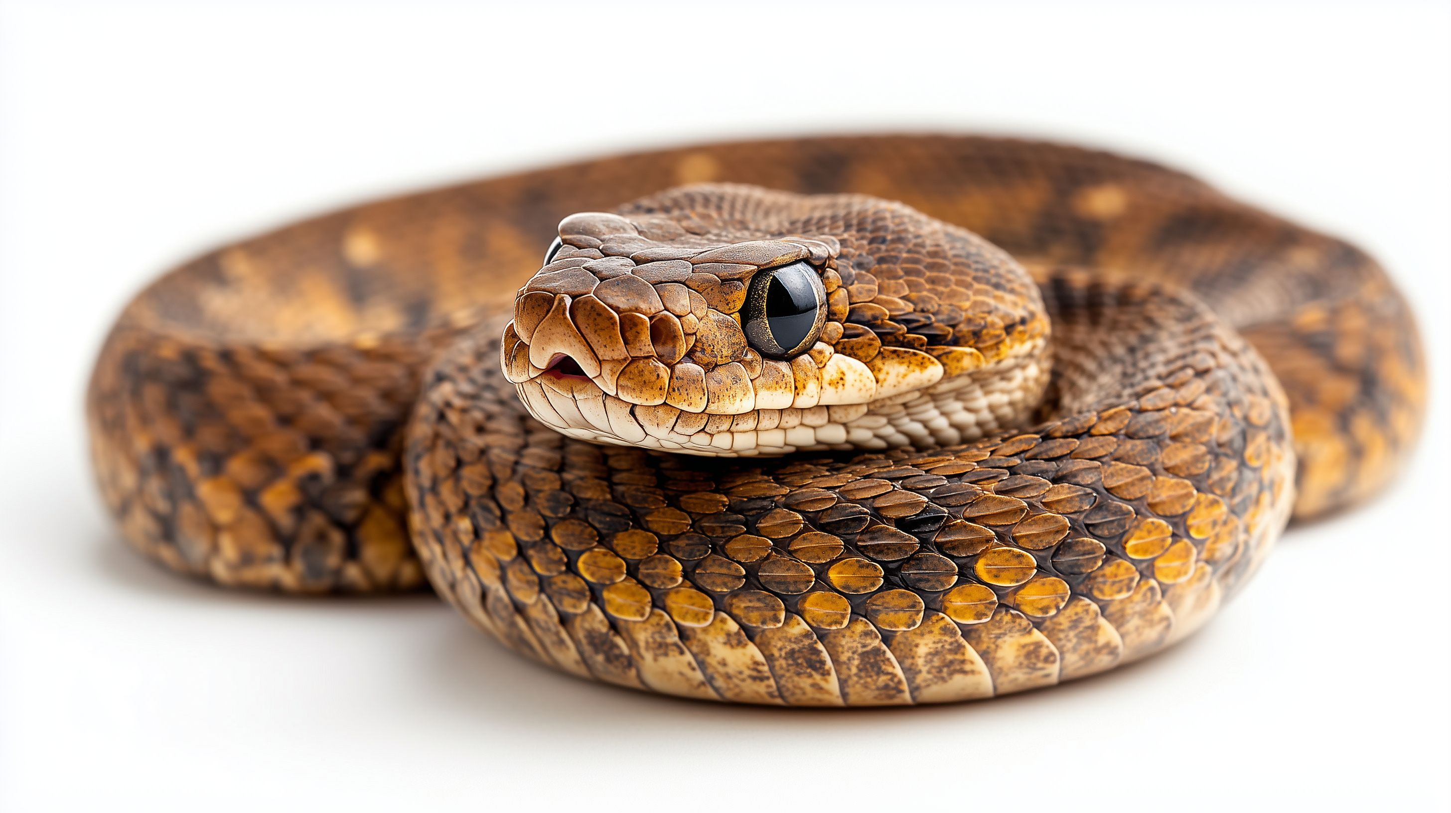 Dieses Foto zeigt eine detaillierte Nahaufnahme einer braunen Kettennatter auf weißem Hintergrund. Die Schlange liegt zusammengerollt und man erkennt ihre markanten Augen, die kräftigen Schuppen und das charakteristische Zickzackmuster ihres Rückens. Das Bild ist scharfgestellt und die Farben sind natürlich und kontrastreich. Es eignet sich ideal als Stockfoto für Beiträge rund um Reptilien, Tiere oder die Natur. Das hochauflösende Foto steht unter Creative-Commons-Lizenz und kann für eine Vielzahl von Projekten, wie Blogs, Newsletter oder Social-Media-Kampagnen, kostenlos genutzt werden.