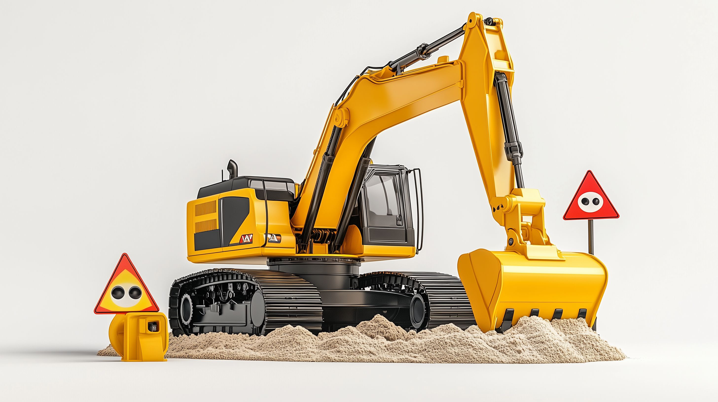 Dieses Foto zeigt einen großen, gelben Bagger auf einer Baustelle. Der Bagger steht auf einem Sandberg und ist bereit, Erdarbeiten durchzuführen. Rote Warnschilder sind an der Seite platziert, um auf die Bauarbeiten hinzuweisen. Das Bild vermittelt einen lebendigen Eindruck von den schweren Maschinen, die auf einer Baustelle eingesetzt werden. Es eignet sich hervorragend als kostenloses Stockfoto in hoher Auflösung unter Creative-Commons-Lizenz für Blogs, Newsletter, Social-Media-Beiträge oder Werbematerialien rund um Themen wie Bauindustrie, Tiefbau, Landwirtschaft oder Infrastruktur.