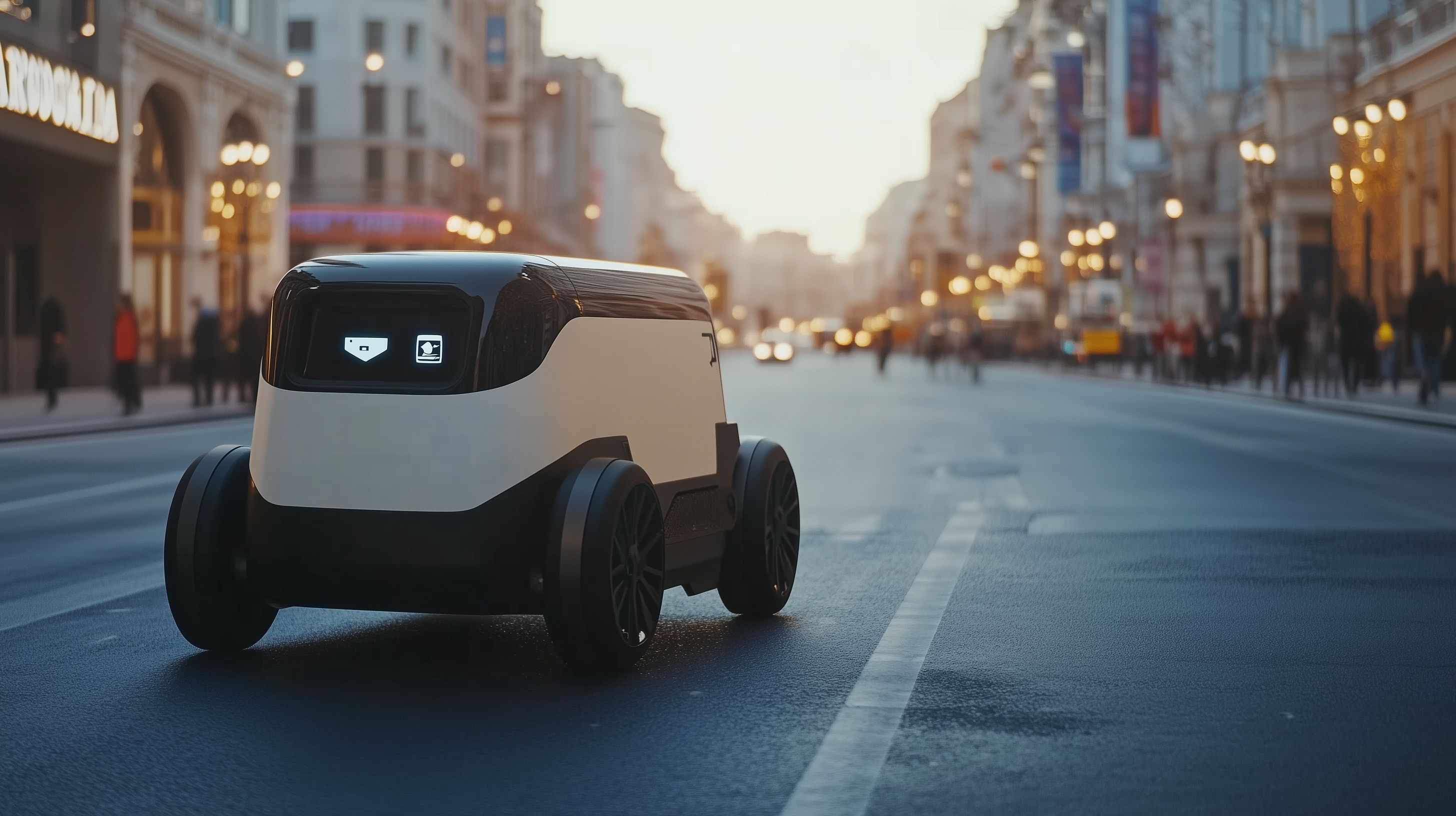 Dieses Foto zeigt einen kompakten, autonomen Lieferroboter, der selbstständig durch eine belebte Stadtstraße fährt. Der fahrerlose Transporter ist in einem futuristischen, schlichten Design gehalten und hebt sich durch seine auffallenden Formen und Beleuchtung vom klassischen Stadtverkehr ab. Im Hintergrund sind Passanten, Geschäfte und Gebäude zu sehen, was den modernen, urbanen Kontext des Roboters verdeutlicht. Das Bild vermittelt den Eindruck einer intelligenten, emissionsfreien Mobilität, die zukünftige Logistiklösungen in Städten prägen könnte. Das hochauflösende Foto eignet sich hervorragend als kostenloses Stockfoto für Beiträge zum Thema Technologie, Digitalisierung und Zukunftsvisionen in Medien, Blogs oder Werbung unter der Creative-Commons-Lizenz.