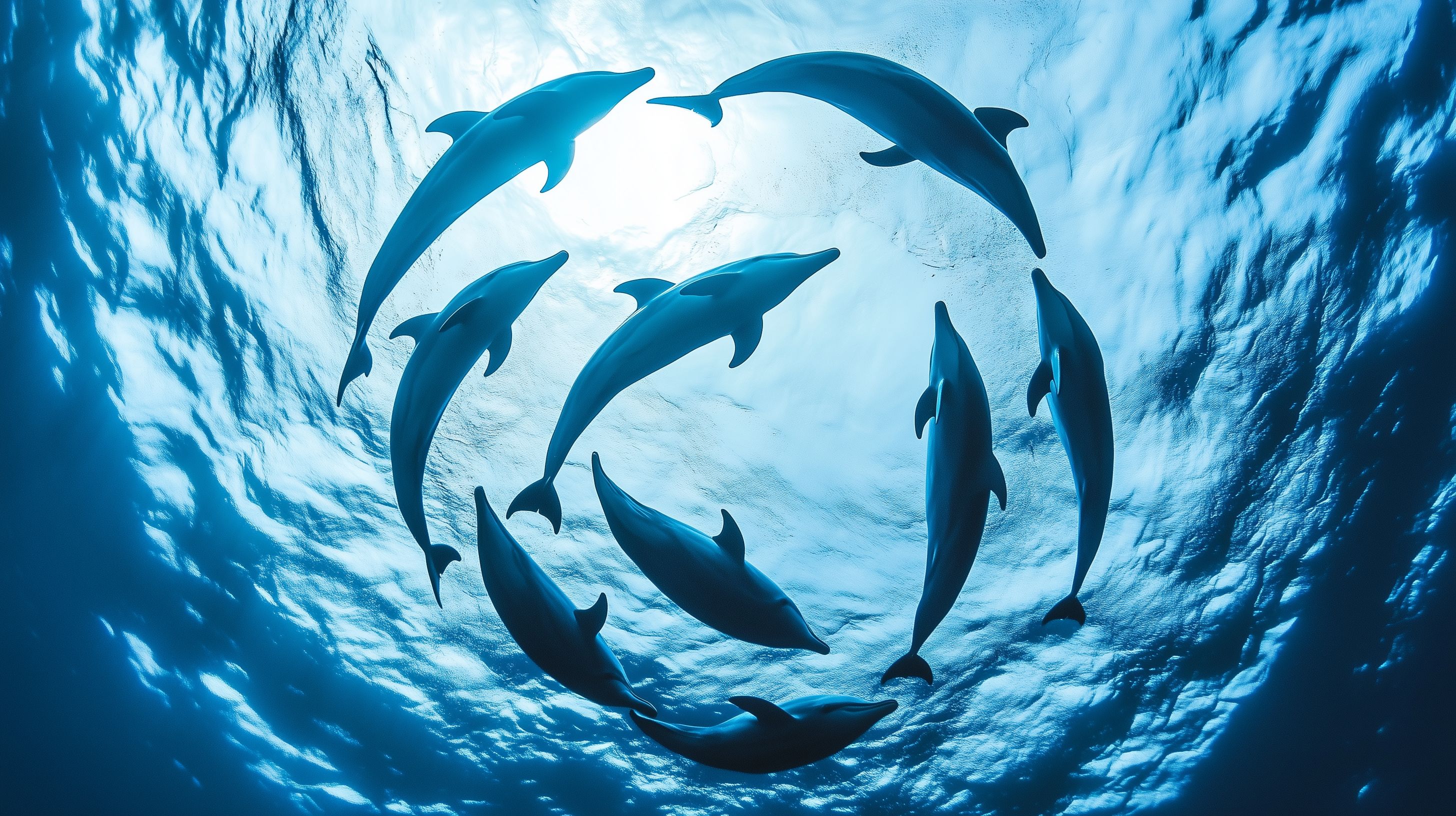 Das Foto zeigt eine Gruppe von Delfinen, die in einer faszinierenden, kreisförmigen Formation im klaren, blauen Wasser des Ozeans schwimmen. Die Tiere sind in Bewegung erfasst, was eine lebendige und dynamische Atmosphäre schafft. Die Unterwasserperspektive lässt den Betrachter eintauchen in diese faszinierende Szene der Natur. Dieses hochauflösende Stockfoto eignet sich hervorragend für die Verwendung in Blogs, Newslettern, Social-Media-Beiträgen oder Werbematerialien, die eine natürliche, maritime Stimmung transportieren möchten. Es steht unter einer Creative-Commons-Lizenz zur freien Nutzung zur Verfügung.